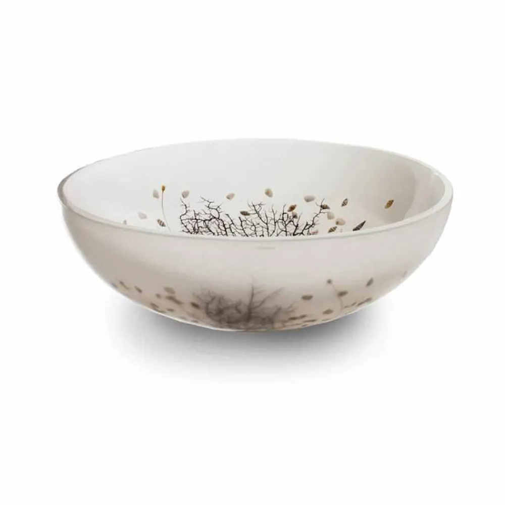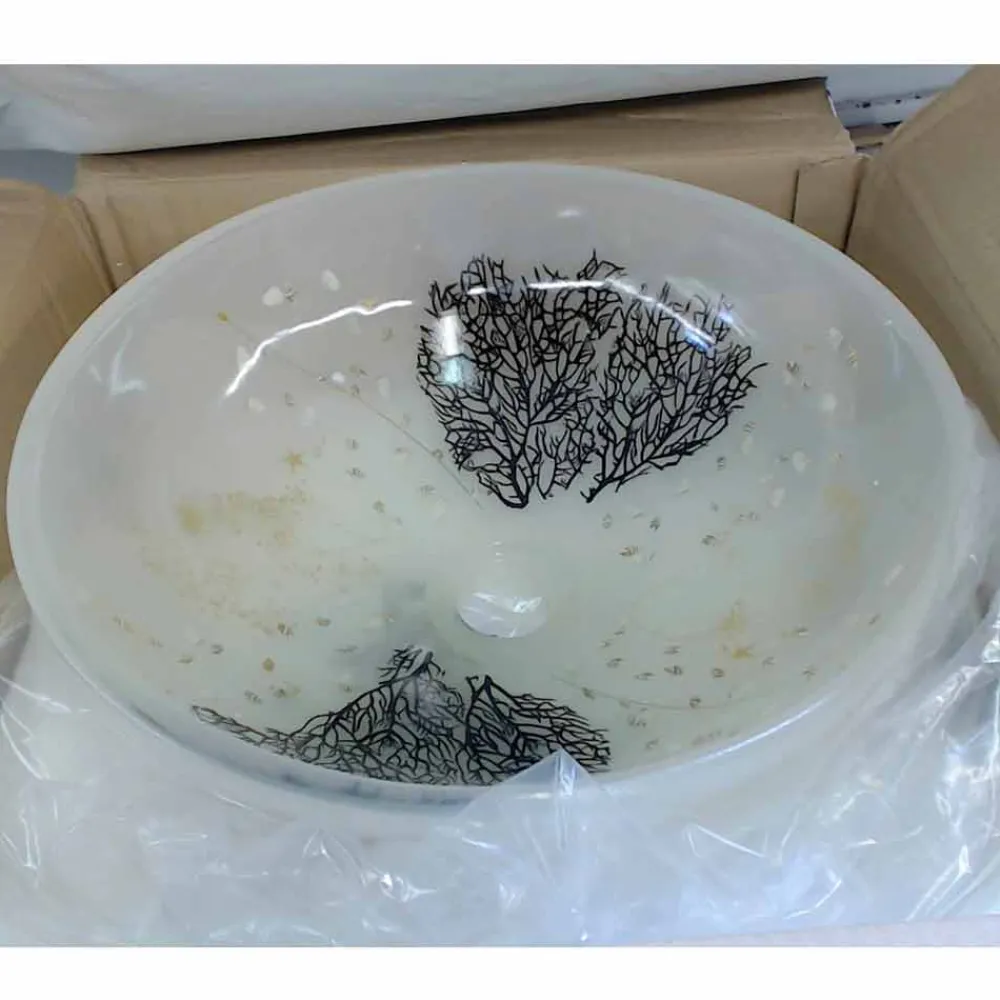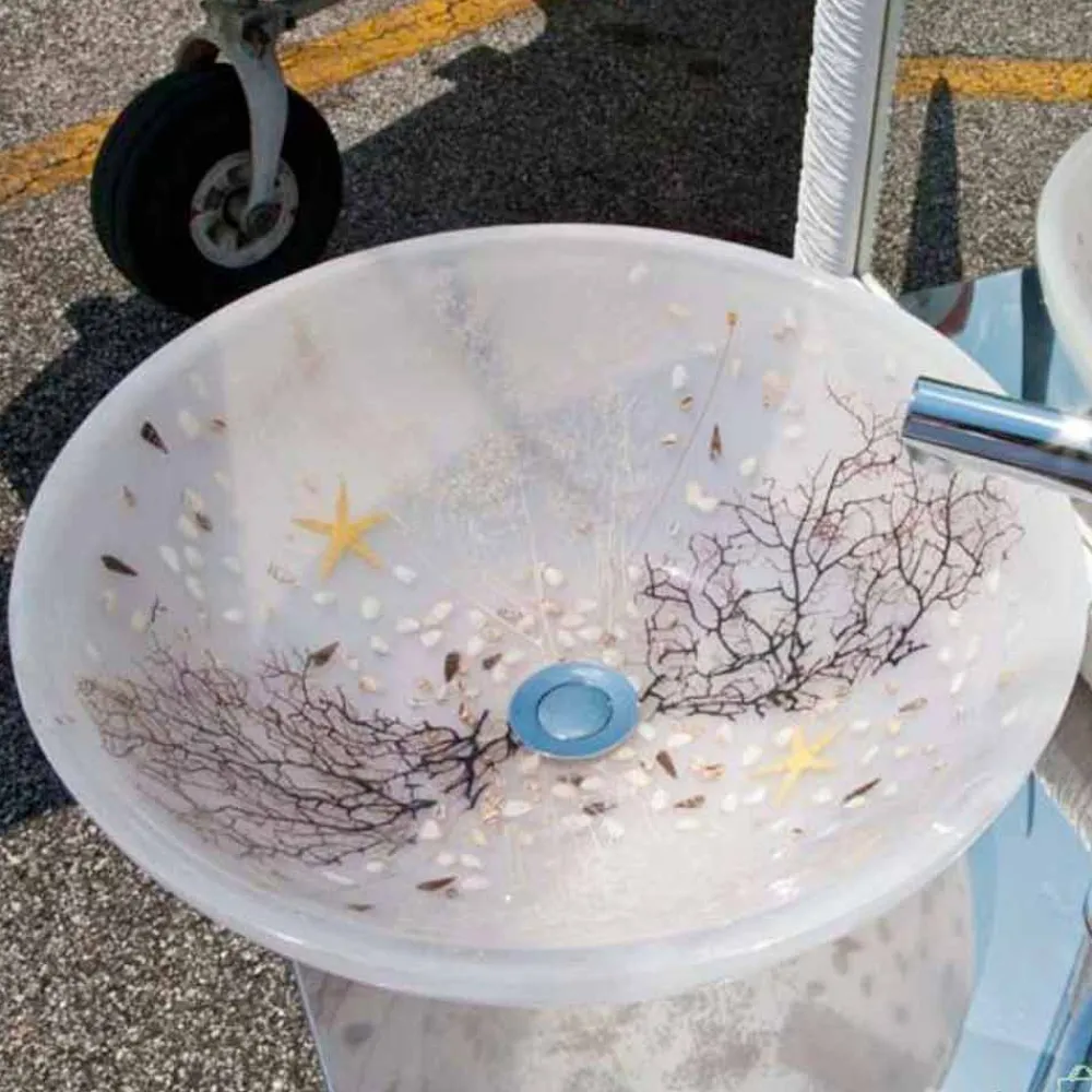 Waschbecken aus transparentem Opalharz mit Einschlüssen von Korallen, Muscheln und Seesternen.