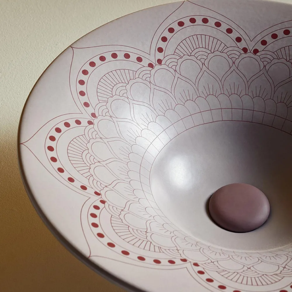 - Inneres Mandala-Reliefdekor auf mattgrauer Emaille, äußere weiße Emaille