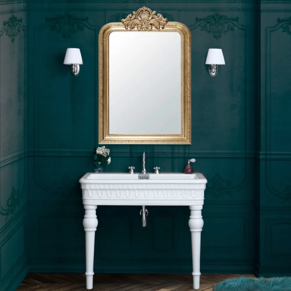Konsolenwaschbecken aus weißer Keramik, handgefertigt durch eine 100% Made in Italy-Produktion . Dieses majestätische und imposante Einrichtungsaccessoire mit klassischem und raffiniertem Design entspringt dem Wunsch, eine Lösung zum Leben zu erwecken, die sowohl in klassischen Räumen als auch in Umgebungen mit moderner Einrichtung eine perfekte Harmonie schafft, in der es einen ungewöhnlichen Kontrast für ein kreatives und originelles bildet Wirkung .