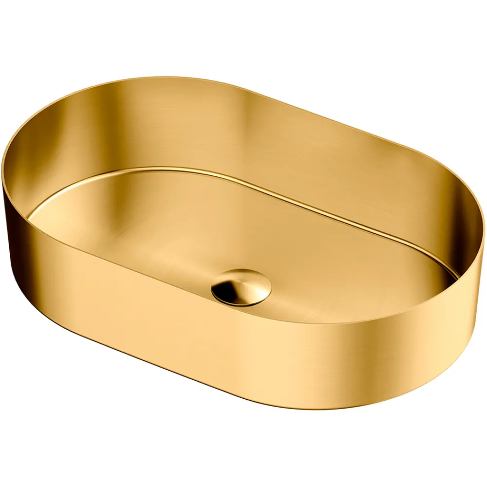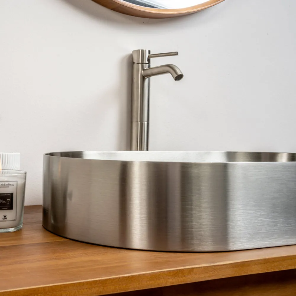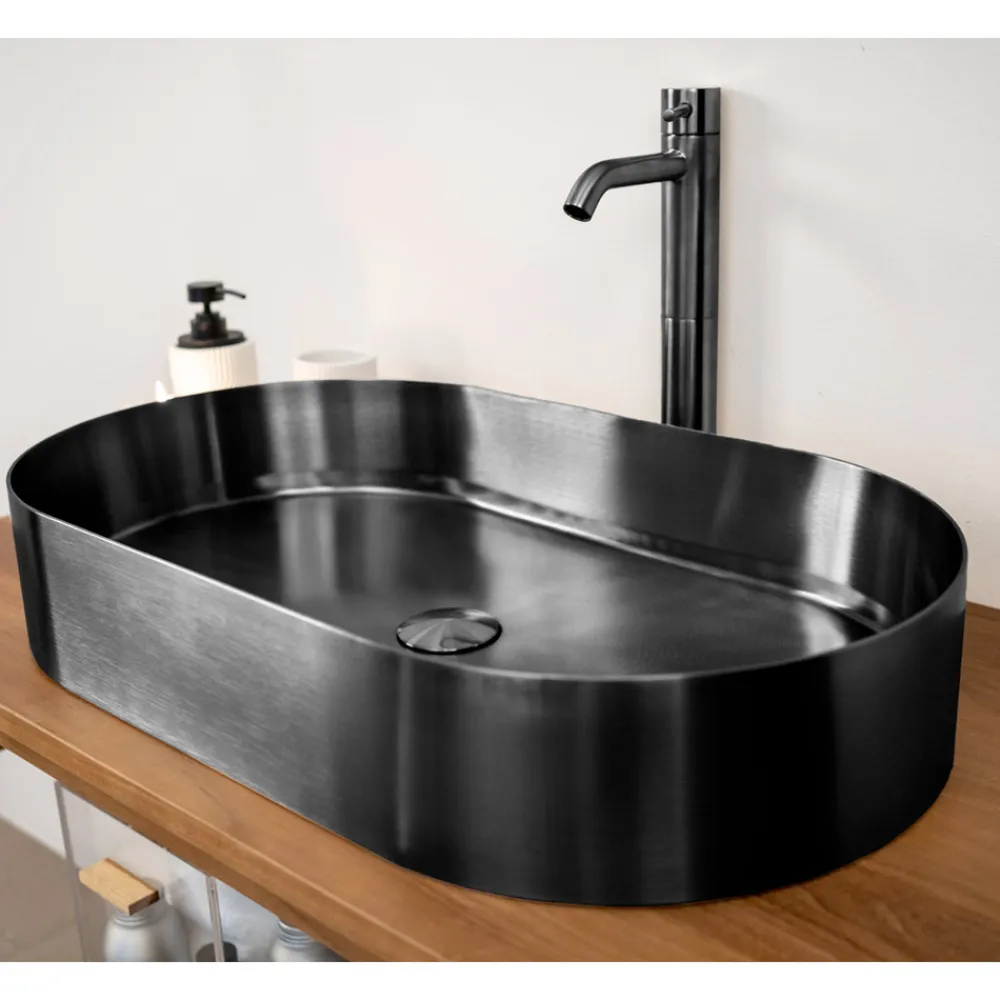 Das ovale Aufsatzwaschbecken aus 3 mm starkem Edelstahl SUS 304 ist ein Juwel an Design und Funktionalität. Es ist aus einem einzigen Metallblech gefertigt und bietet eine klare, moderne Ästhetik. Die Endbearbeitung der PVD+Nano-Beschichtung in Kombination mit sorgfältigem Bürsten verleiht dem Objekt ein attraktives und fast rätselhaftes Aussehen und verbessert den Glanz sowie die Widerstandsfähigkeit gegen Flecken und Kratzer. Das Design zeichnet sich durch ausgewogene Formen und ideale Proportionen aus in drei Ausführungen , die sich elegant an jede Umgebung anpassen. Darüber hinaus machen raffinierte Details wie die mitgelieferte passende Ablaufabdeckung und der völlige Verzicht auf sichtbare Schweißnähte dieses Waschbecken zu einem wahren Meisterwerk der Handwerkskunst und des Designs und machen es zu einem herausragenden Stück für Badezimmer mit luxuriöser und zeitgemäßer Ausstrahlung.