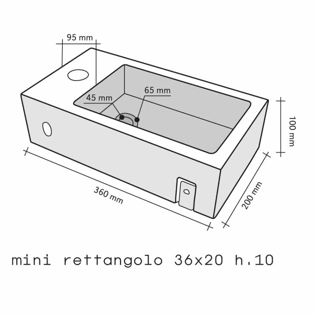 36 x 20 x H 10 cmRechteckige Geometrie und scharfes Design lassen dieses Aufsatzwaschbecken an den Retro Look erinnern. Die Geometrie dieses Waschbeckens wurde fein erarbeitet, rechteckig aber nicht zu kantig, um die Dynamik dieses Stils nicht zu verwischen. Mit seiner kleinen Ablage, dient dieses Waschbecken nicht nur zum Händewaschen, sondern trifft auch beim Zähneputzen seine außerordentliche Funktion.