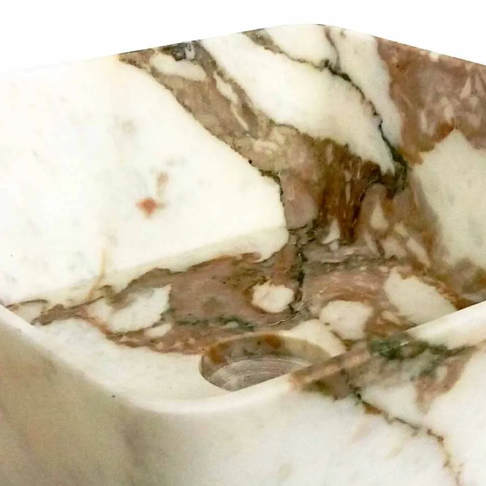 Wunderschönes und elegantes Waschtischbecken, das sich durch die quadratische Form auszeichnet, die es in seiner Art einzigartig macht. Dieses von Handwerksmeistern in Italien handgefertigte Produkt ist die ideale Lösung, um Funktionalität und Schönheit zu kombinieren und so eine raffinierte und stilvolle Atmosphäre in jedem Badezimmerbereich zu schaffen, der in einem modernen und raffinierten Stil eingerichtet ist. Das für seine Realisierung verwendete Material ist Calacatta- Marmor, ein weißer Marmor mit dünnen gelbbraunen Adern in einem mehr oder weniger hellgrauen feinkörnigen Beton, der durch braune Adern gekennzeichnet ist. Das Finish ist glatt und wird dank technischer Spezifikationen erhalten, die es dem Produkt ermöglichen, noch mehr Qualität zu erhalten.