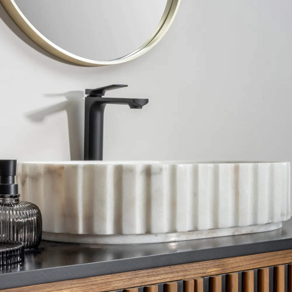 Dieses Aufsatzwaschbecken ist ein wahres Kunstwerk, das aus einem einzigen Block ausgewählten Marmors geschnitzt wurde und die natürliche Schönheit des Steins mit seinen einzigartigen Maserungen und Farbnuancen zelebriert. Seine äußere Form zeichnet sich durch weiche Linien und subtil gearbeitete Details aus, die ein elegantes und modernes Profil schaffen. Jedes Stück ist ein Unikat , sodass niemand sonst ein identisches Waschbecken besitzt. Es ist mit einem Klick-Klack-Ablaufgarnitur aus Marmor ausgestattet, was die luxuriöse Ästhetik unterstreicht und ein stimmiges Design gewährleistet. Es ist die ideale Wahl für alle, die ihrem Badezimmer einen Hauch von Klasse und Einzigartigkeit verleihen möchten.
