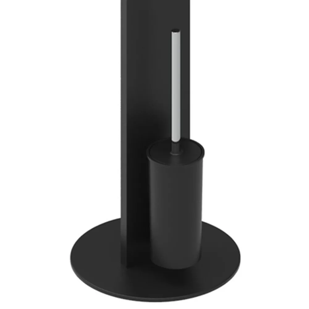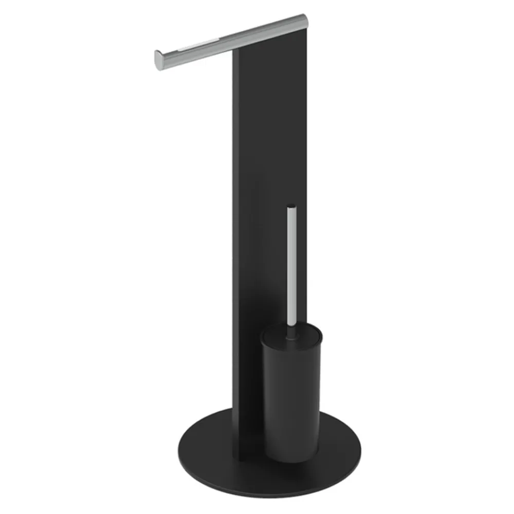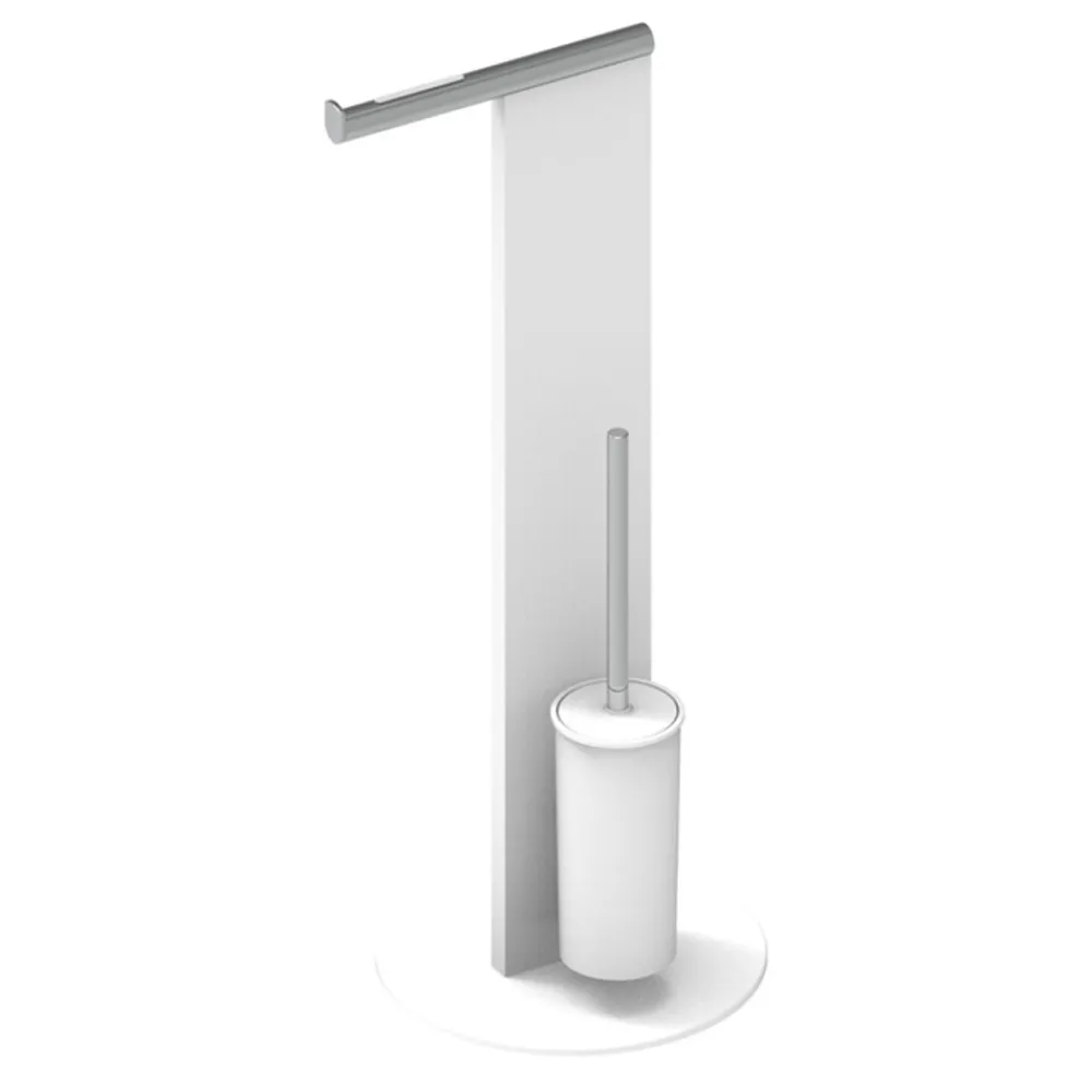 Dieser freistehende Papierrollenhalter und WC-Bürstenhalter für das Badezimmer ist komplett aus weiß oder schwarz und verchromtem Aluminium gefertigt.