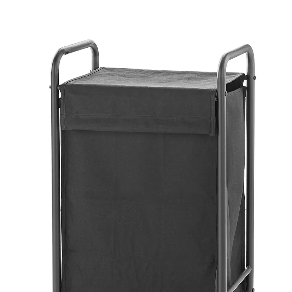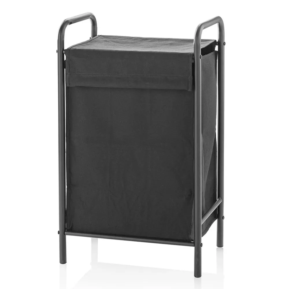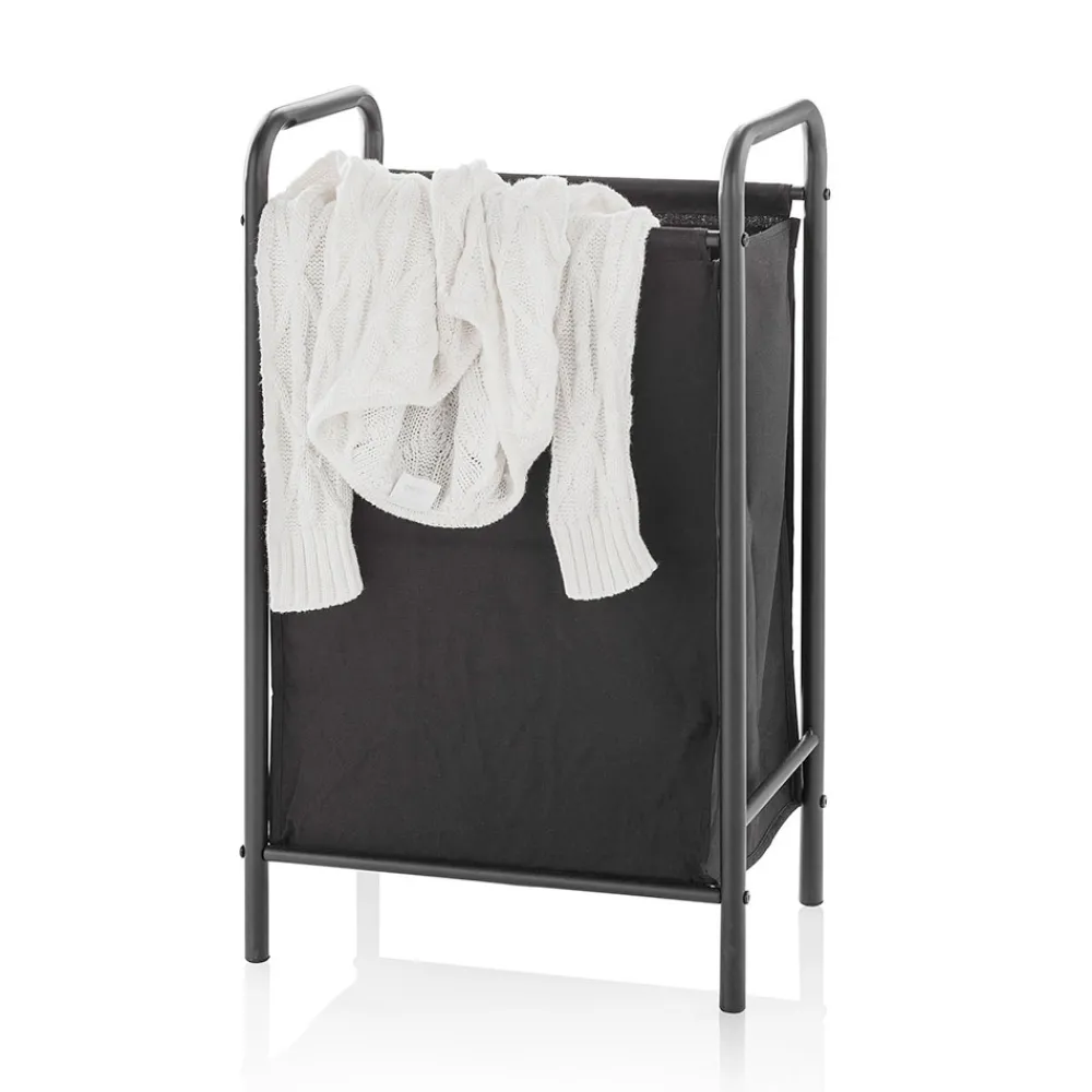 Korb mit Metallstruktur und Wäschehalter aus mattschwarzem Stoff.