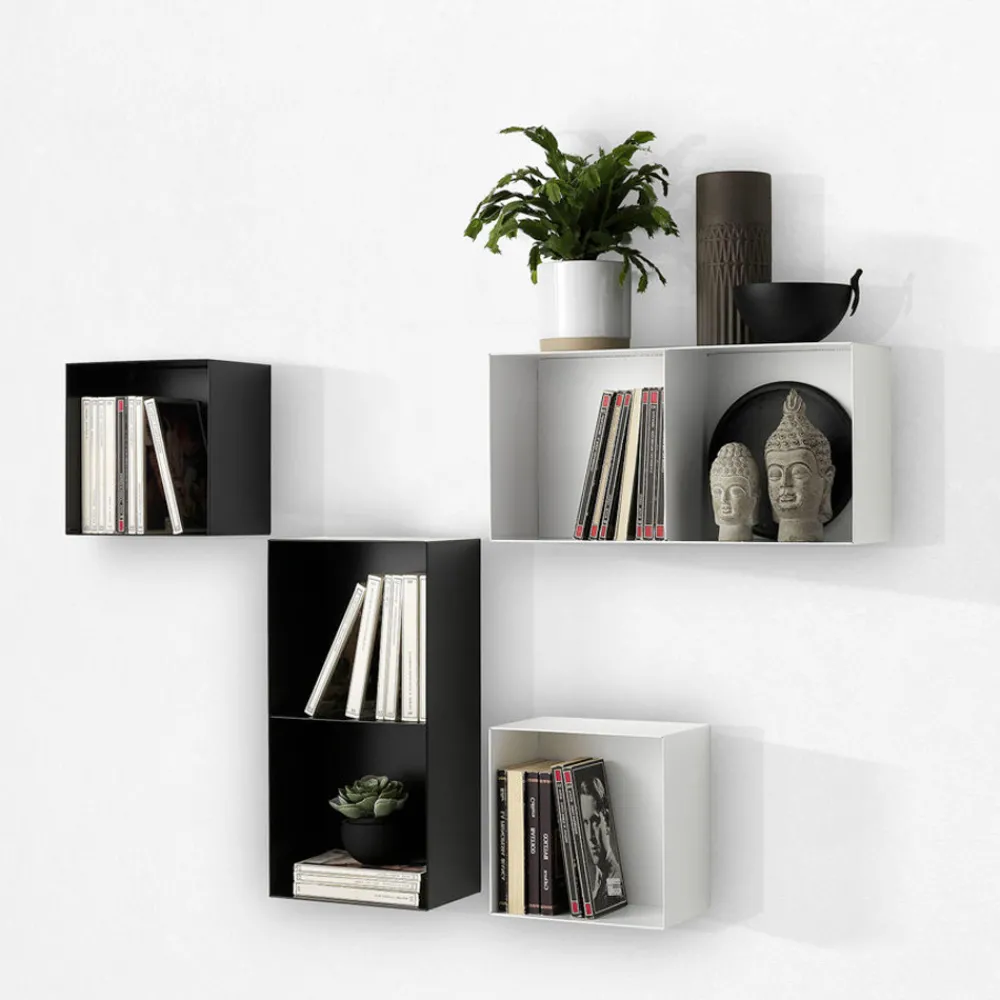 Reversibles quadratisches Wandelement aus gebogenem Metall und wahlweise weiß oder schwarz lackiert.
