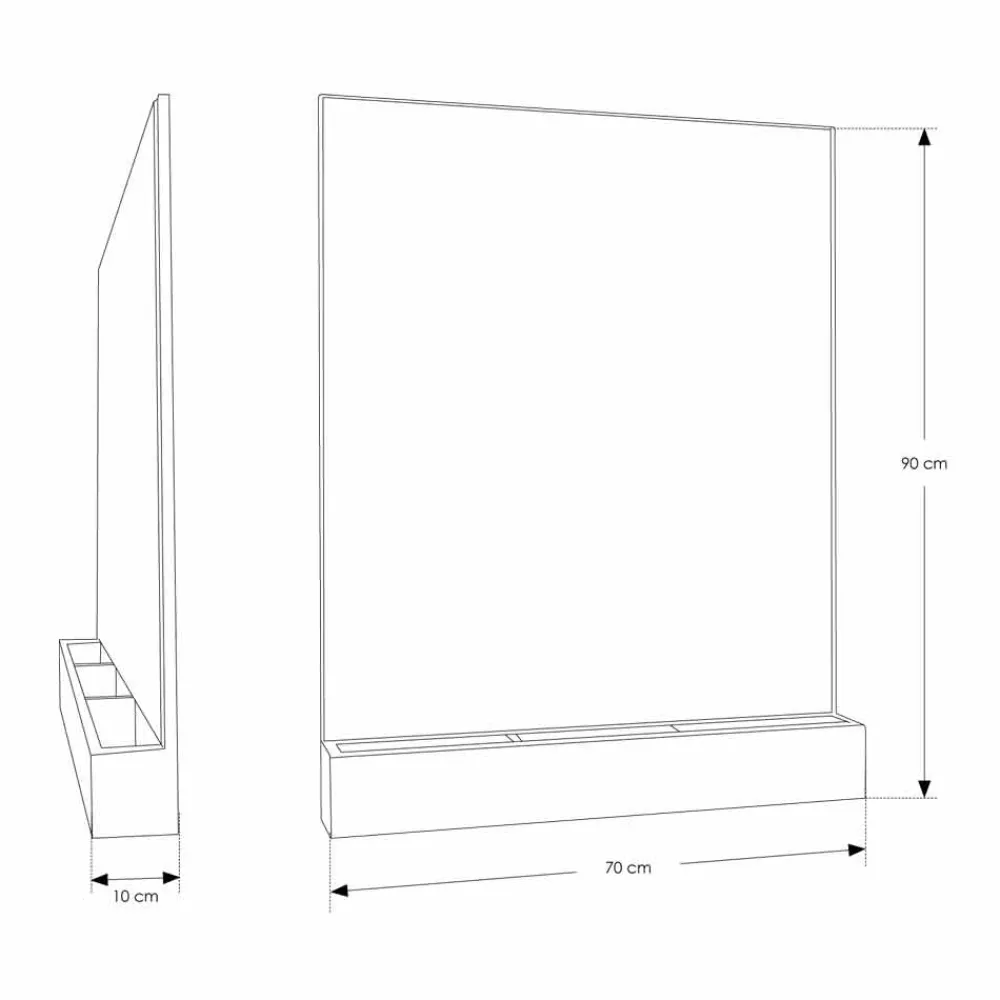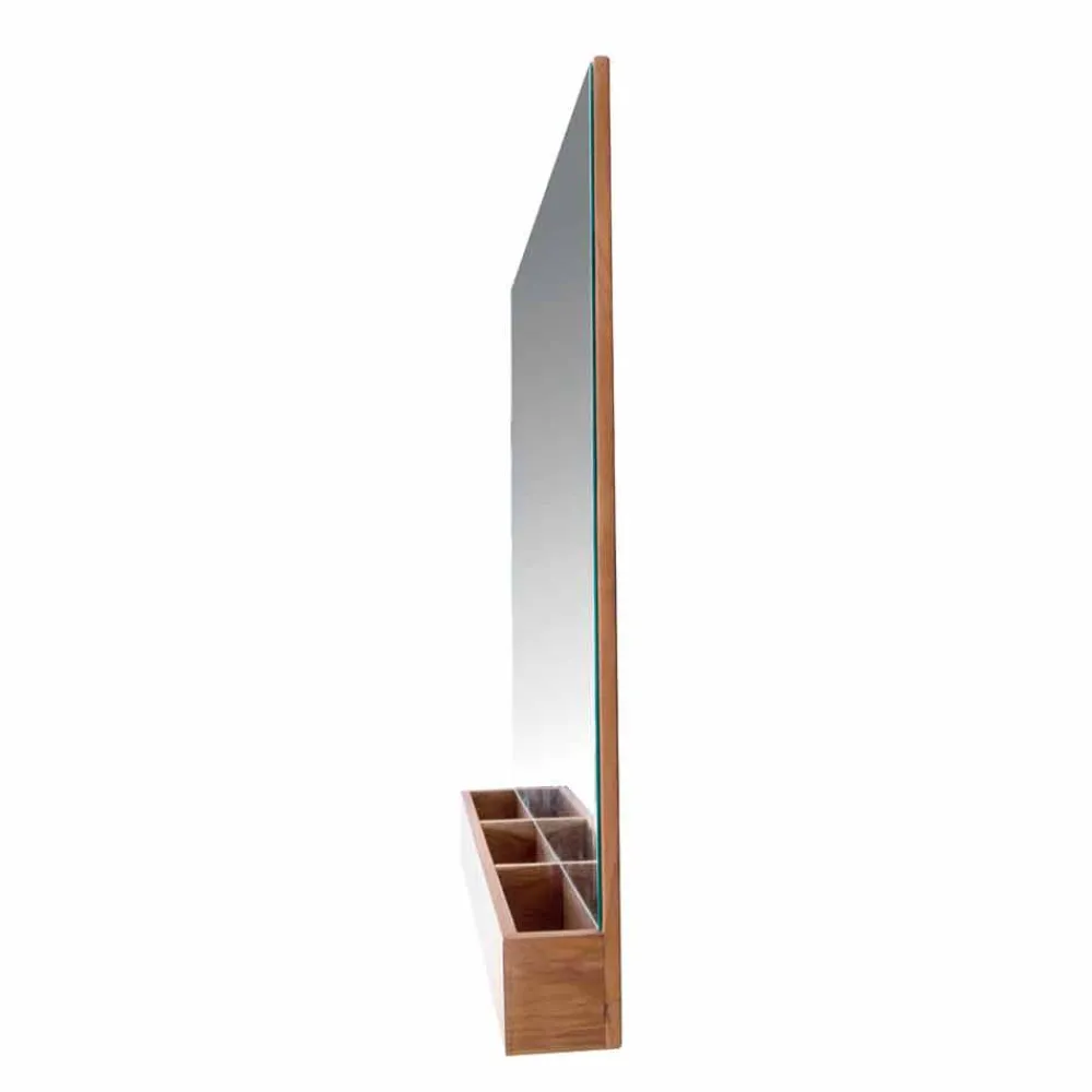 Abgeschrägter Spiegel , der auf eine natürliche Burma-Teakplatte aufgebracht und mit einem Teakholztablett ausgestattet ist. Die praktischen Fächer sind ideal zur Aufnahme von Kosmetika, Spendern, Zahnbürstenhaltern etc… Aufsätze nur zur vertikalen Positionierung.