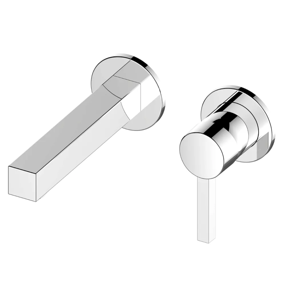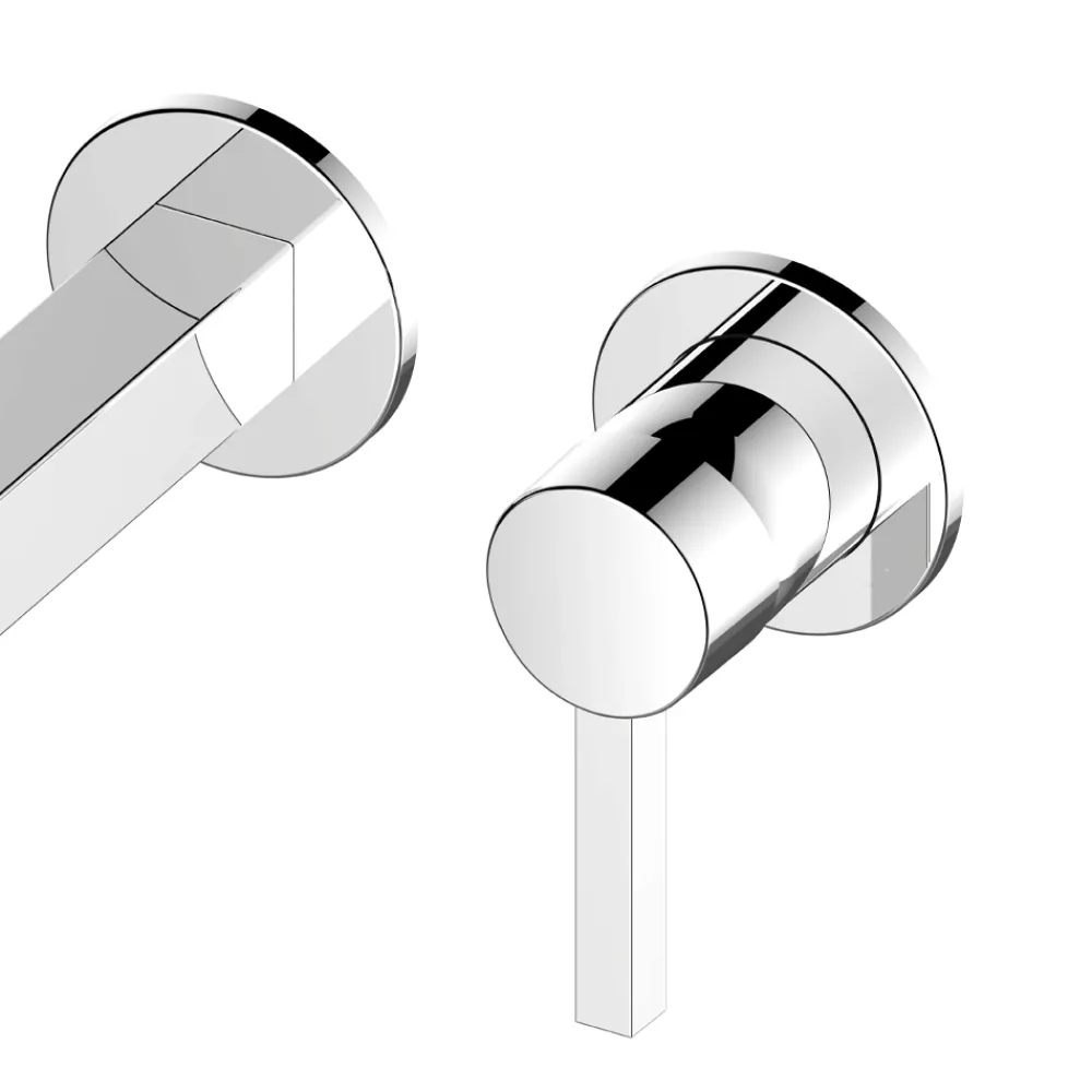 Dieser wandmontierte Einhebel-Waschtischmischer verfügt über ein quadratisches Design auf runden Elementen.