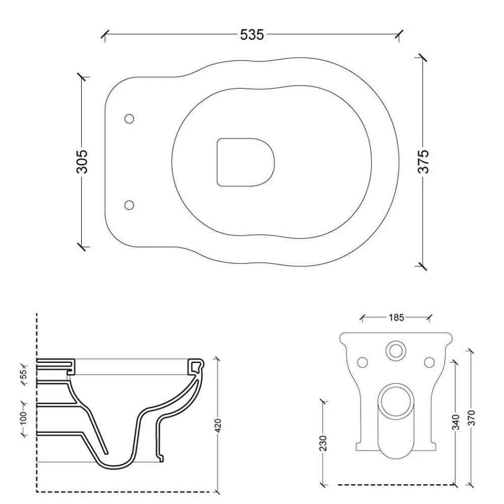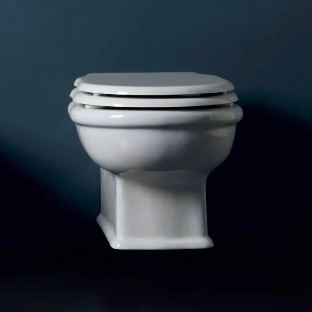Hängende Toilette aus Keramik mit Befestigungsbügeln und Schnellbefestigung inklusive.