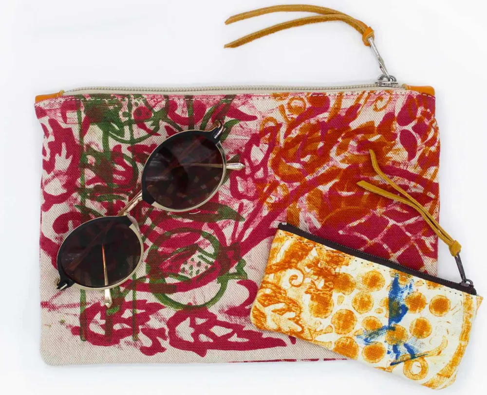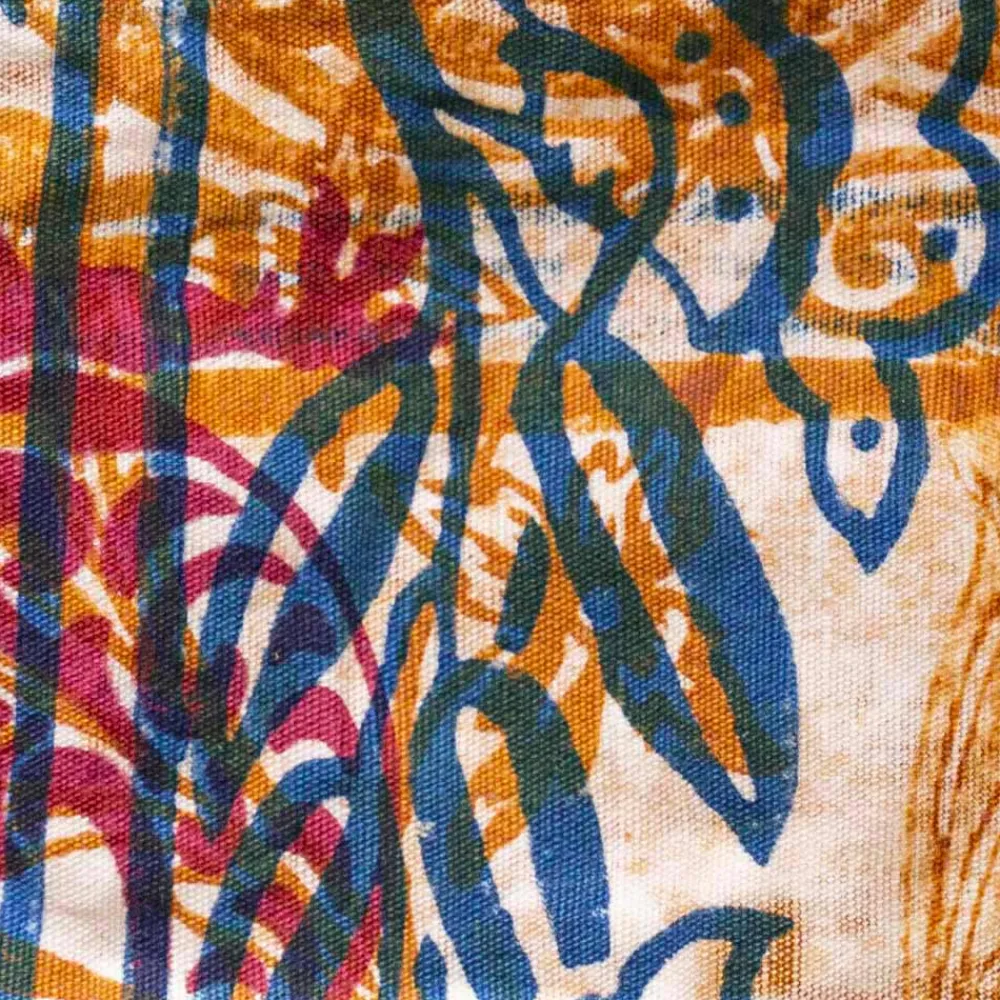 - Handabdruck : Diese Phase dauert Monate. Der Stoff wird auf die Werkbank unter den verschiedenen Gegenständen gelegt, die sich abwechseln und in monatelanger Arbeit gedruckt werden. Die verschiedenen Farben und Designs werden aufgrund des Drucks der Holzform „spontan“ auf diesen Stoff übertragen und überlappen sich. Das Endergebnis wird eine Explosion unvorhersehbarer und nicht wiederholbarer Farben und Schattierungen sein.