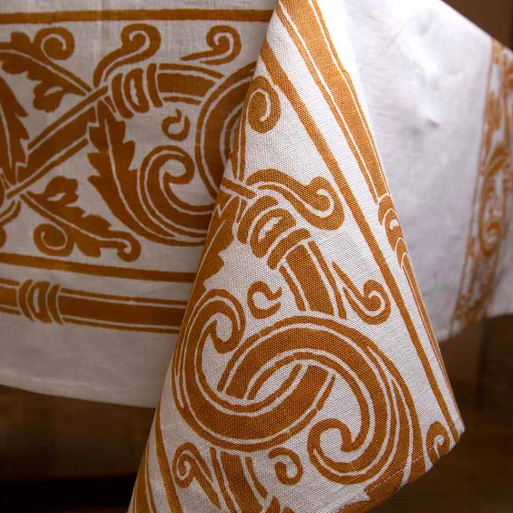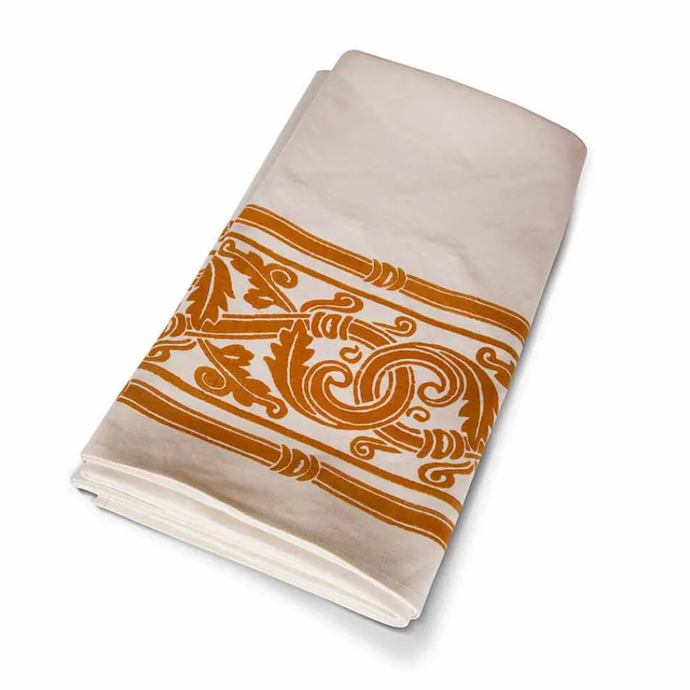 Hoch gearbeitete italienische Tischdecke aus Leinen und Baumwolle mit feinem und künstlerischem Handabdruck in Rostfarbe an den Rändern und in der Mitte, Handarbeit auf exklusiven antiken Stoffen aus Italien.