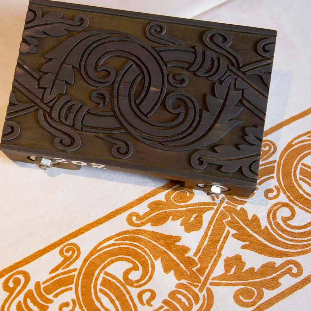 - Handdruck : große Geschicklichkeit für diese Phase, die von Hand mit Holzformen stattfindet, in die das Design von Hand eingraviert wurde. Die Farbe wird auf dem Pad verteilt, auf das die Form getaucht wird, das dann auf dem Stoff positioniert wird. Mit einem schweren Holzhammer wird es über die Form geschlagen, um das Design auf dem Stoff zu beeindrucken.