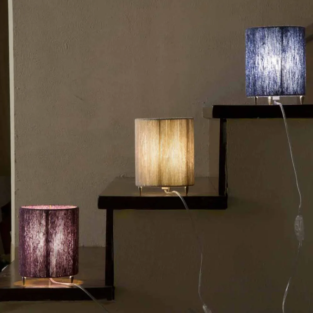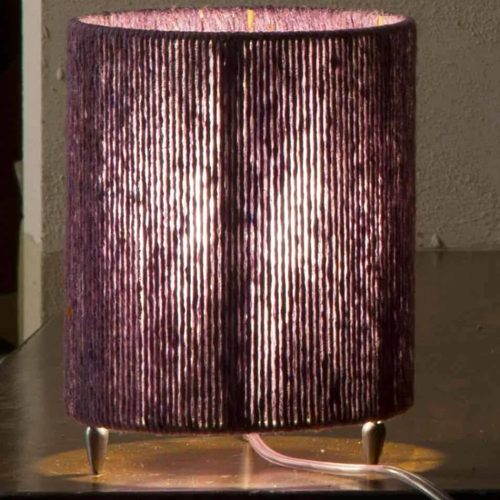 Evita ist die handgefertigte Stehlampe mit einer in Wolle gehüllten Struktur und einer Schnur, die mit einem Seil umwickelt ist.