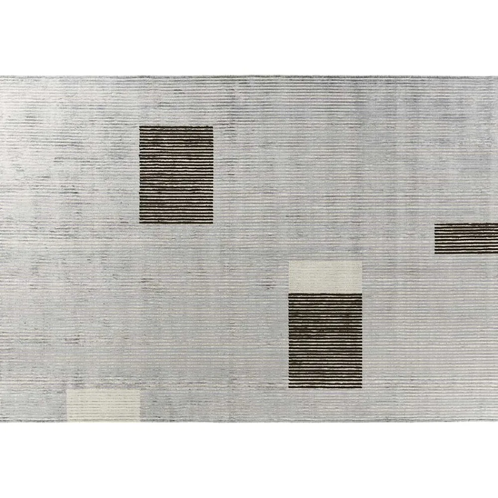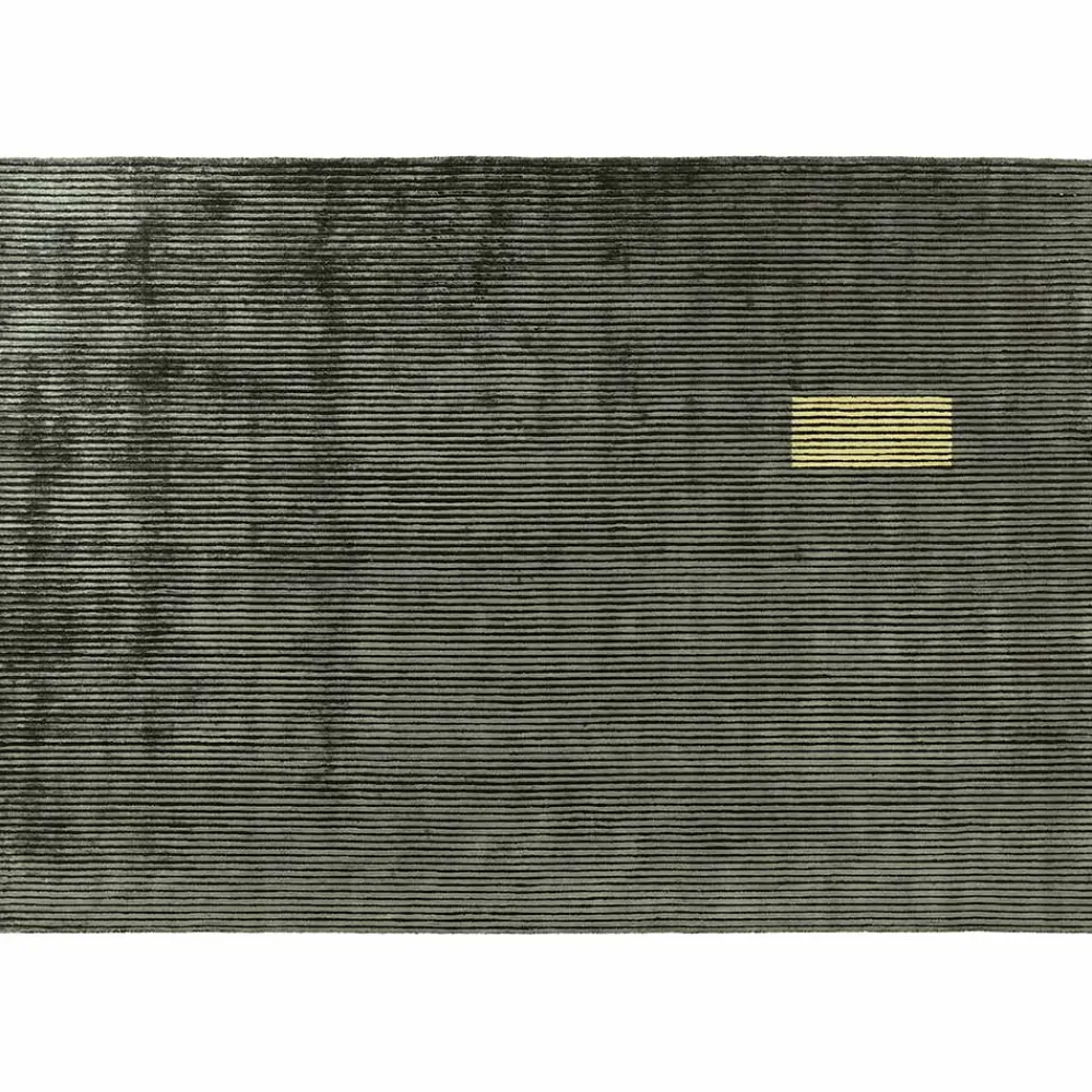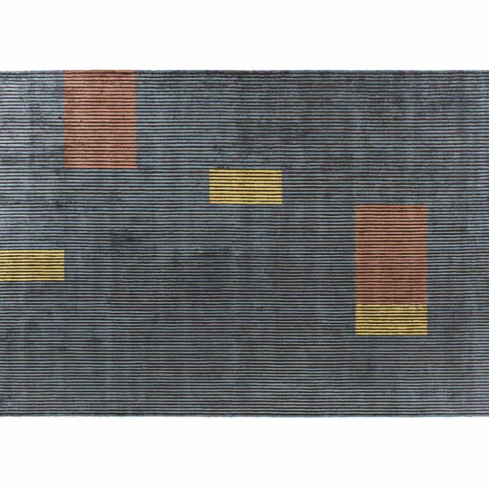 Das besondere Element dieses Teppichs aus weicher und angenehm anzufassender Viskose wird sicherlich durch die Abfolge vertikaler Relieflinien repräsentiert, die von Hand geschnitzt wurden und von Rechtecken in verschiedenen Farben unterbrochen werden.