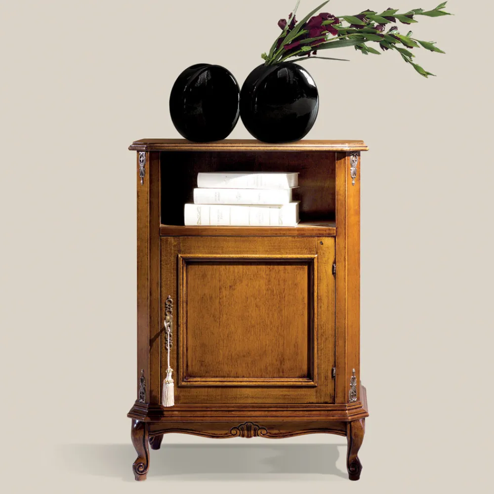 Dieser Telefonhalter im klassischen Stil fügt sich elegant in Umgebungen wie Eingangsbereiche, Wohnzimmer oder Schlafzimmer ein. Er besteht aus wertvollem Bassano-Walnussholz und hat eine Tür und ein Fach.
