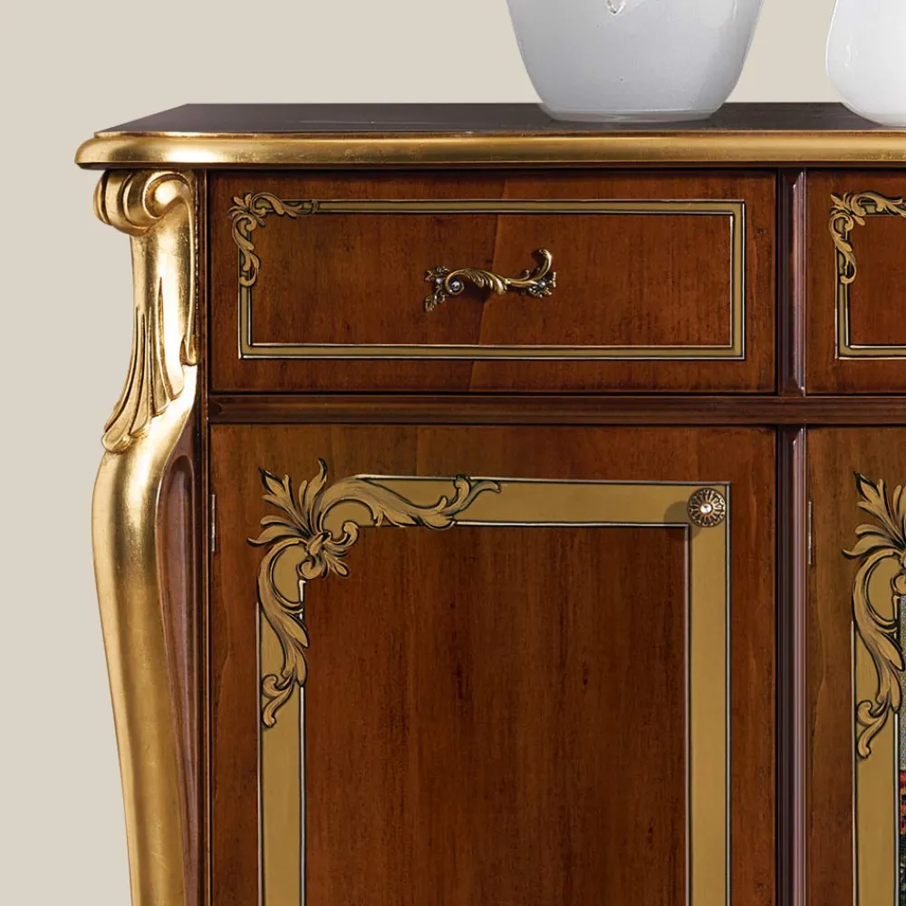 Dieses Sideboard im klassischen Stil ist perfekt, um ein Wohnzimmer, ein Arbeitszimmer oder ein Schlafzimmer mit Stil und Eleganz zu dekorieren. Es besteht aus Holz in Elfenbein, Nussbaum oder mit venezianischem Dekor und hat 4 Türen und 3 praktische und geräumige Schubladen . Eine einzigartige und raffinierte Ergänzung, die vollständig in Italien von erfahrenen Handwerksmeistern hergestellt wird, Meister der Kunst, die jede Ergänzung mit Weisheit und Geschmack für Eleganz vervollständigen. Die Produktion erfolgt unter Verwendung hochwertiger Materialien und mit der größten Sorgfalt und Professionalität, die die Produkte Made in Italy auszeichnet .