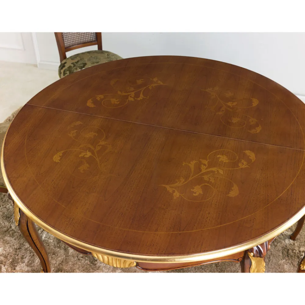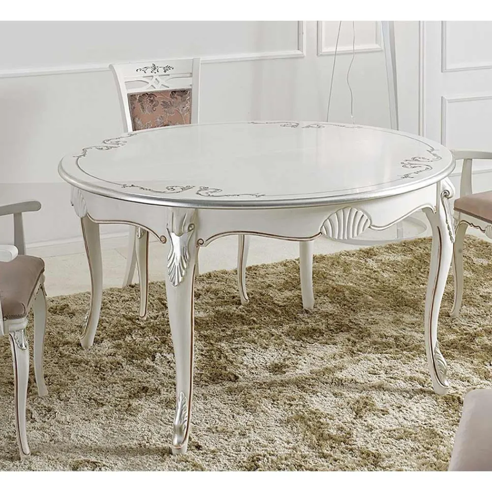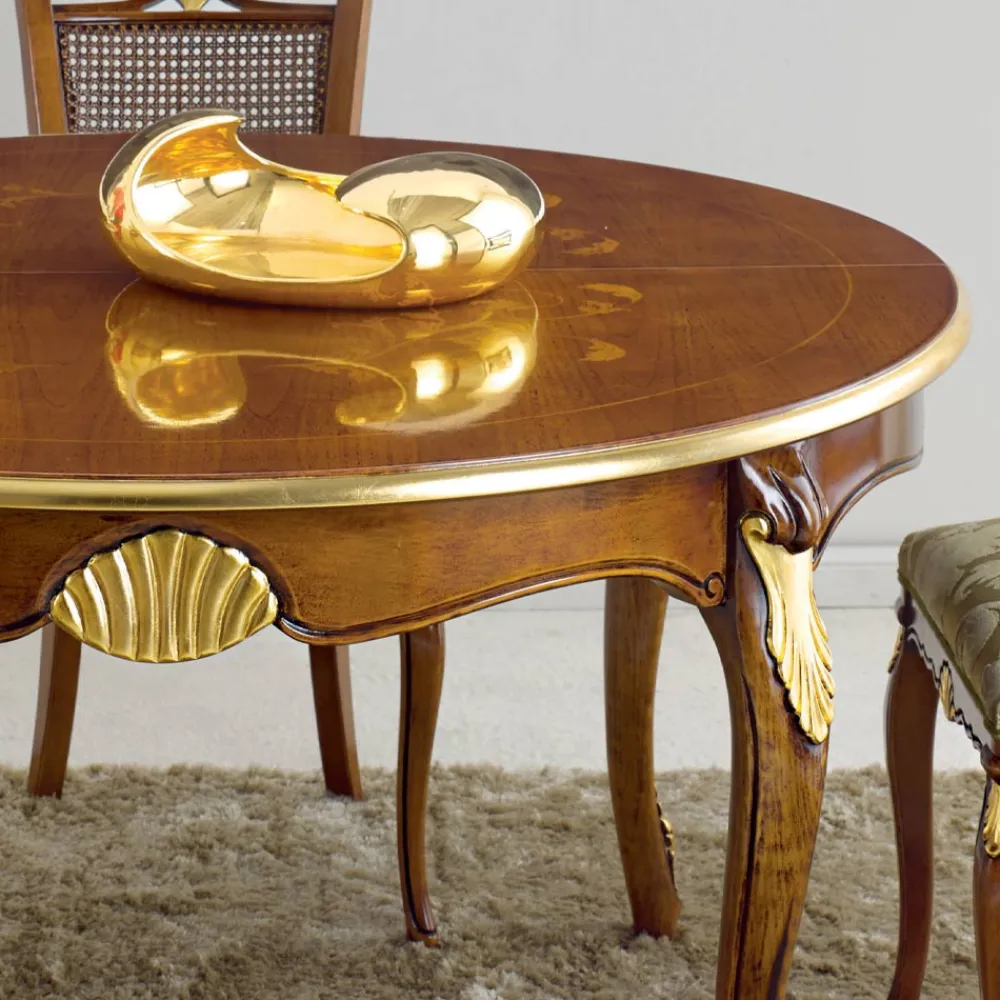 Esstisch mit runder Platte, erweiterbar auf bis zu 240 cm dank zweier interner Verlängerungen von 50 cm, vollständig aus Holz gefertigt und in den Holzoberflächen Bassano Nussbaum und Antikgold oder Weiß und Silber erhältlich.