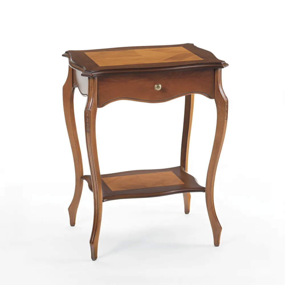Couchtisch für den Innenbereich mit Gestell aus Massivholz , Rahmen , Paneelen und anderen Teilen aus Erlenfurnier mit Intarsien und 1 Schublade , vollständig in Italien hergestellt.