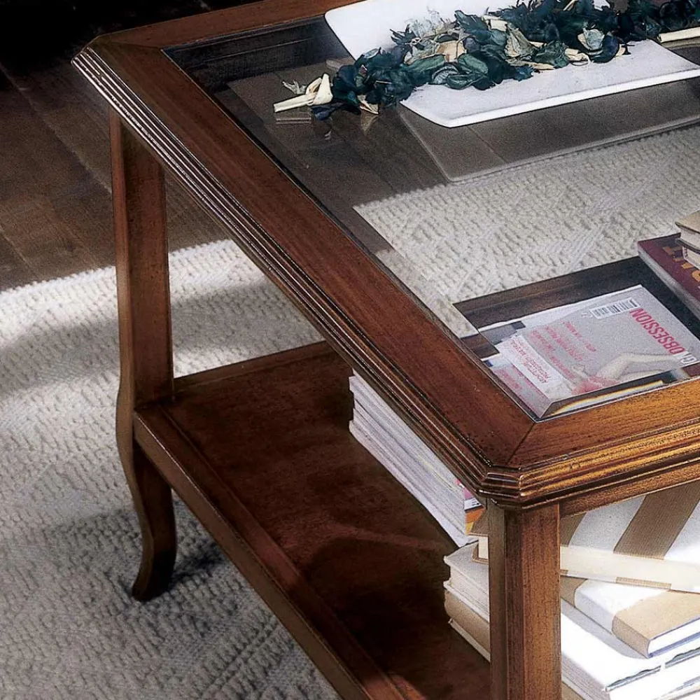 Couchtisch für den Innenbereich mit Struktur aus furnierten Holzpartikeln aus Tanganjika/Toulipier , Rahmen aus Toulipier/Ayous und vollständig in Italien hergestellter Glasplatte .