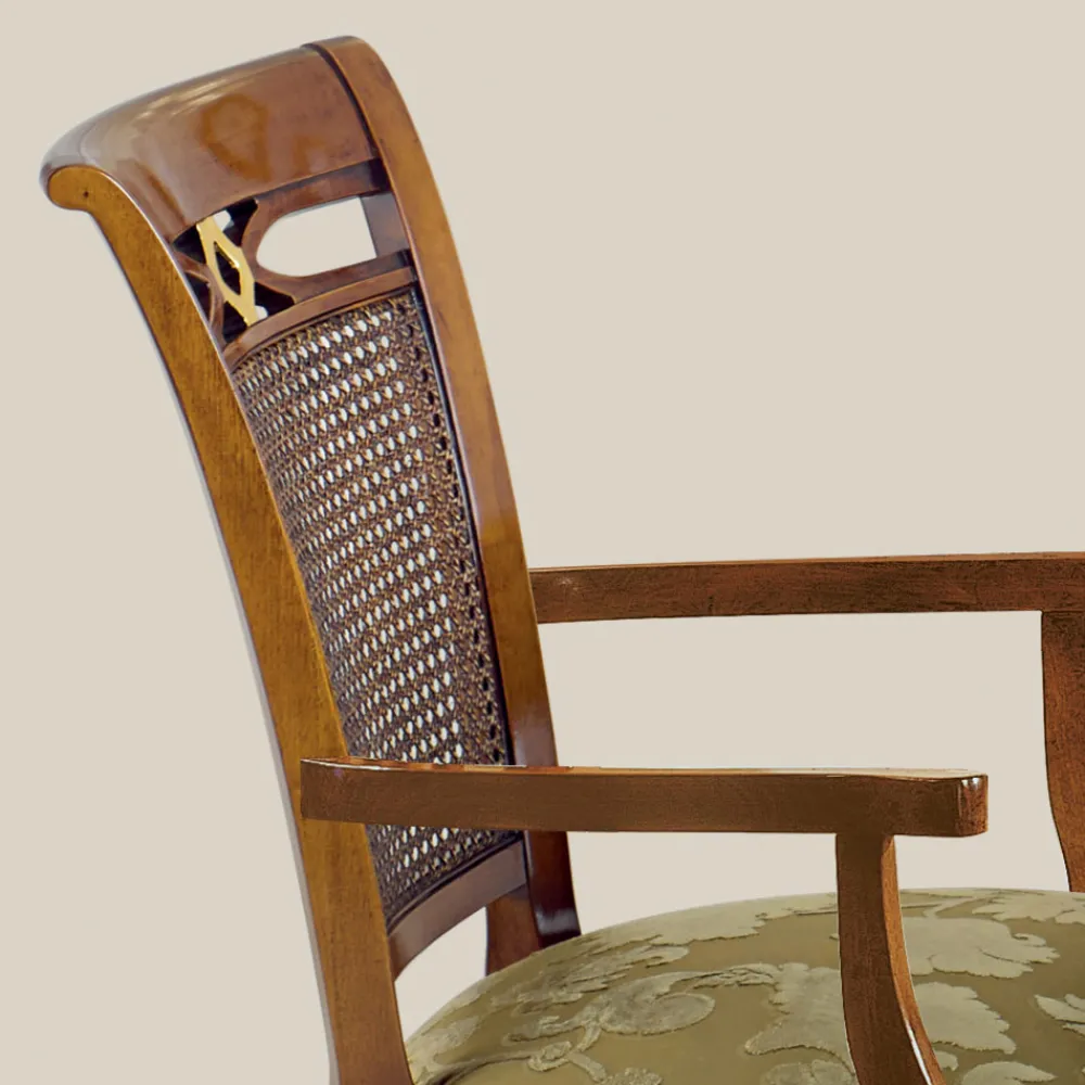 Esszimmerstuhl im zeitlos klassischen Stil , perfekt um jeden Wohnbereich mit Persönlichkeit und Eleganz zu dekorieren . Dieser Stuhl hat eine Struktur aus Holz mit Bassano-Nussbaum und Antikgold-Finish und eine Sitzfläche mit gepolsterter Sitzfläche, die mit Stoff bezogen ist, mit einer Rückenlehne aus Wienerstroh . Außerdem kann zwischen der Version mit oder ohne Armlehnen gewählt werden.