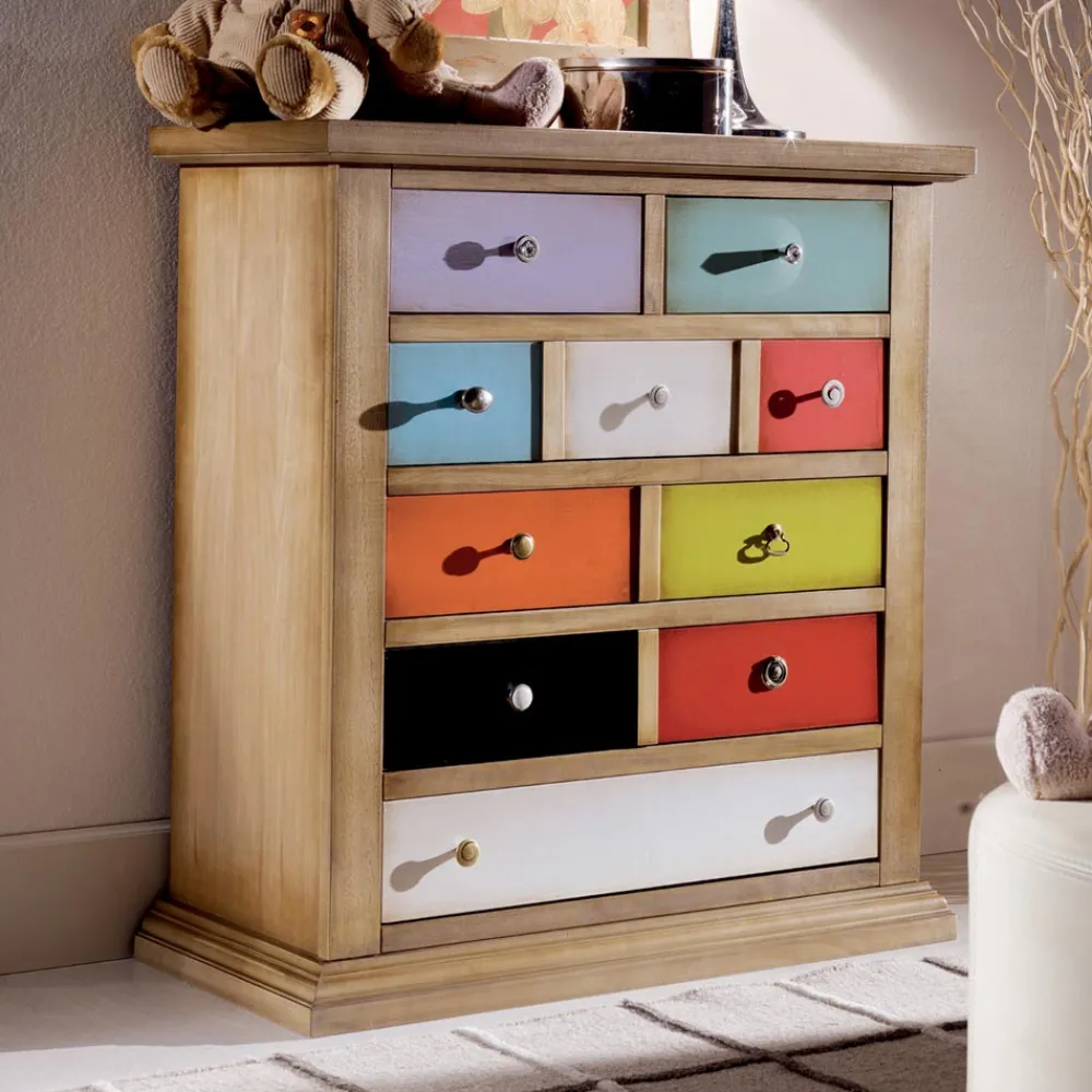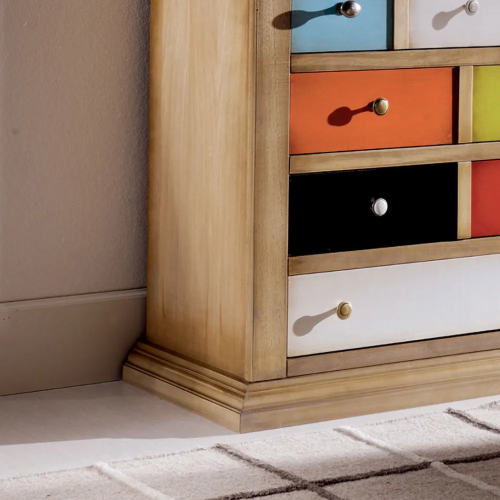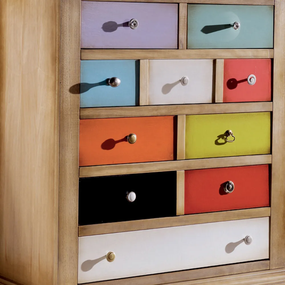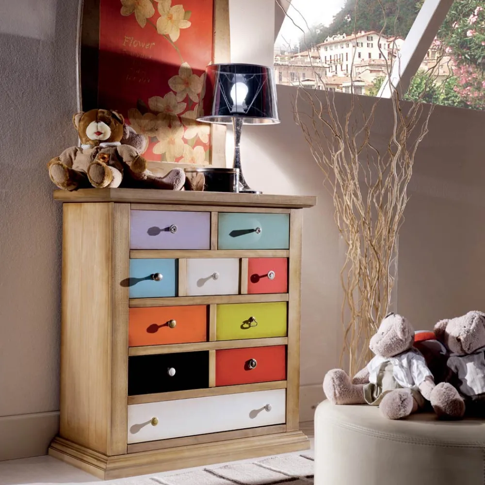 Freude und Verspieltheit sind die Merkmale, die dieses Element mit kräftigen, leuchtenden Farben und den besonderen Formen der Griffe beschreiben. Eine originelle Neuinterpretation eines Möbelstücks mit großer Funktionalität und Kapazität , das in jeder Wohnumgebung zum Aufbewahren und Organisieren von Gegenständen nützlich ist, ohne dass diese im Raum herumliegen müssen.