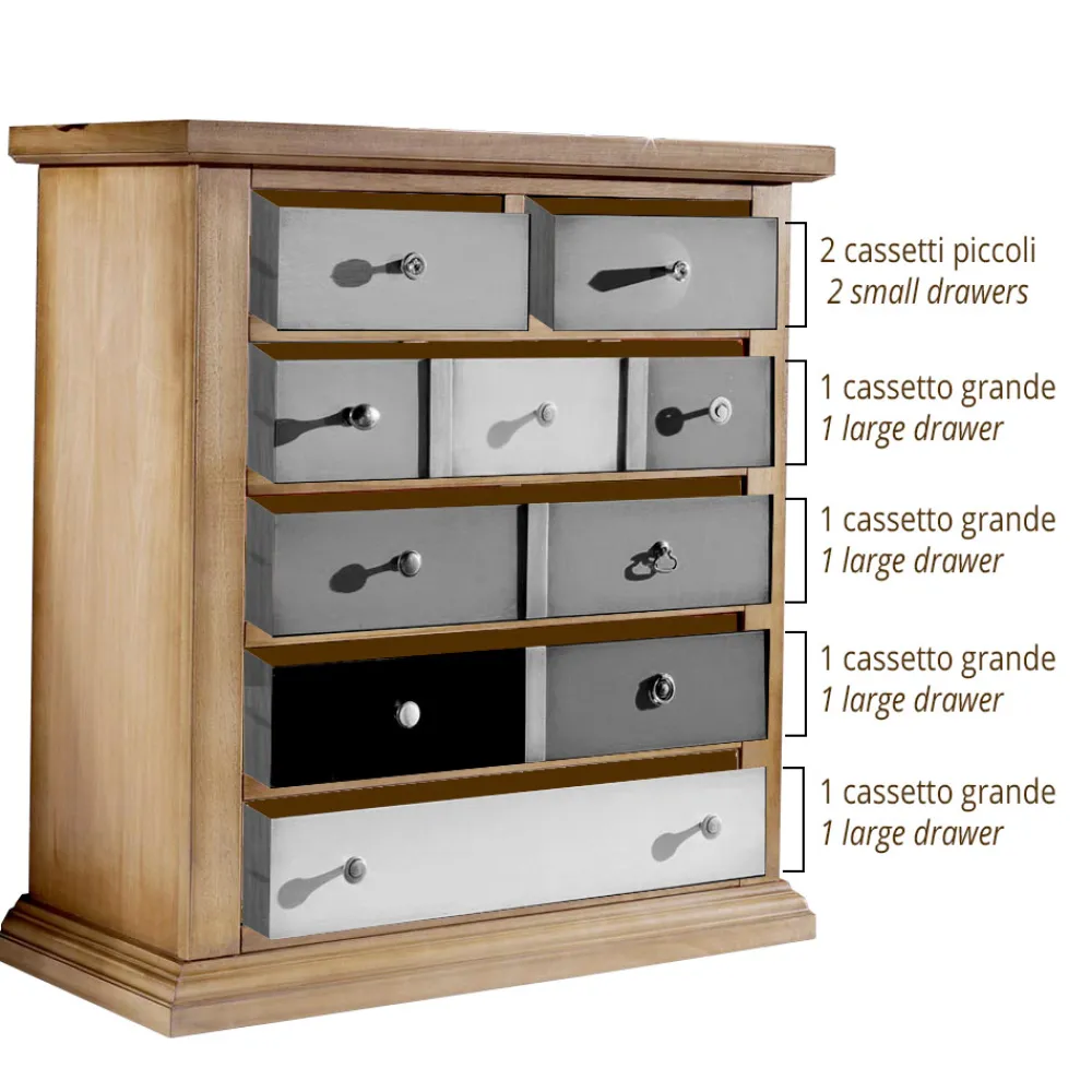 Hinweis: Auf Anfrage sind verschiedene Ausführungen erhältlich. Das Design der Schubladen ist rein ästhetisch. Von oben beginnend gibt es 2 kleine Schubladen, gefolgt von 4 großen.
