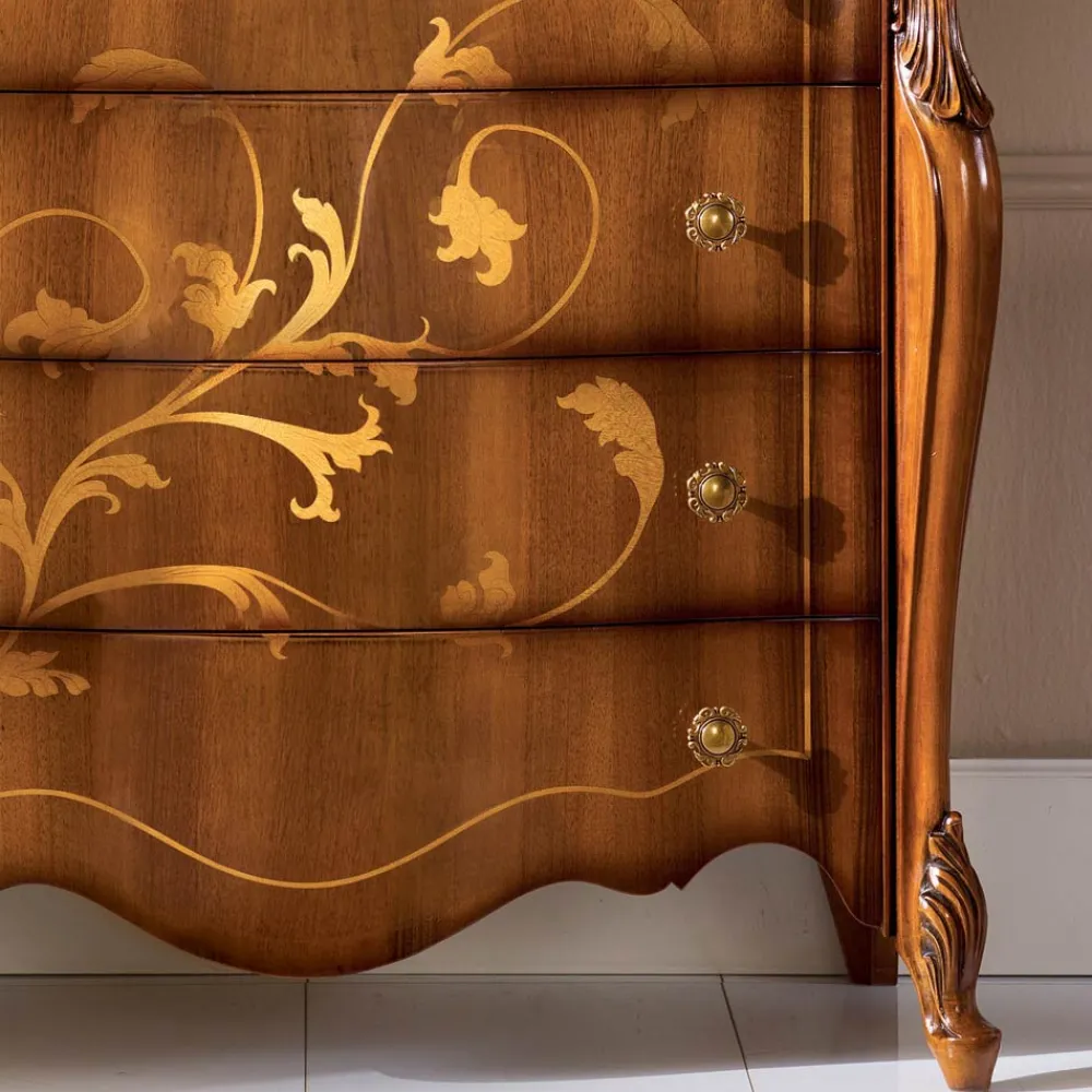 Kommode im klassischen Stil aus Bassano Nussbaumholz mit 4 praktischen und geräumigen Schubladen und eleganten Intarsien. Eine einzigartige und raffinierte Ergänzung, die vollständig in Italien von erfahrenen Handwerksmeistern hergestellt wird, Meister der Kunst, die jede Ergänzung mit Weisheit und Geschmack für Eleganz vervollständigen. Die Produktion erfolgt unter Verwendung hochwertiger Materialien und mit der größten Sorgfalt und Professionalität, die die Produkte Made in Italy auszeichnet .
