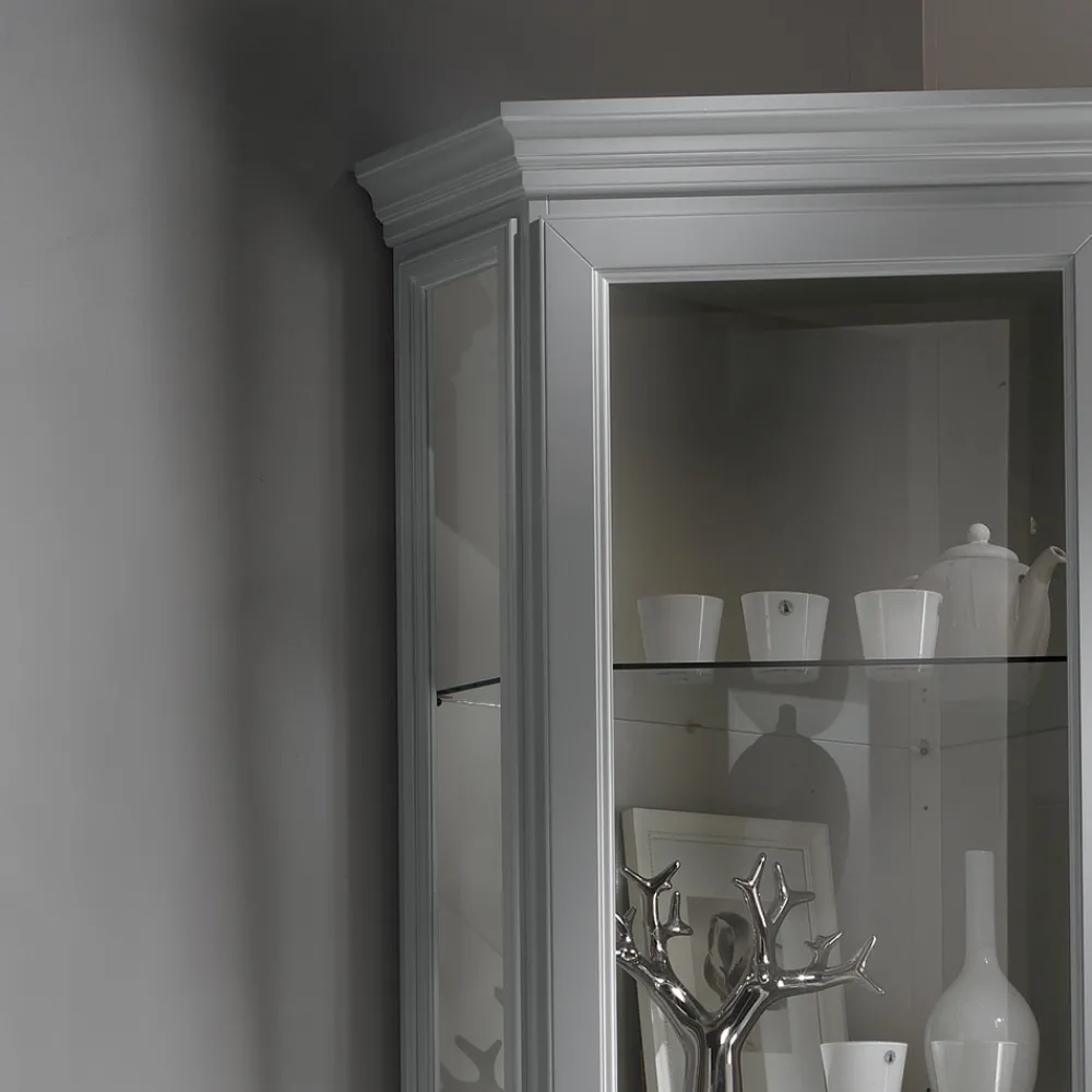 Eckvitrine mit massiven Teilen aus Ayous und Linde , Paneelen aus furnierten Holzpartikeln aus Rosenholz, Tanganjika und Pappel, mit 1 Glastür und 2 Holzregalen, vollständig in Italien hergestellt.
