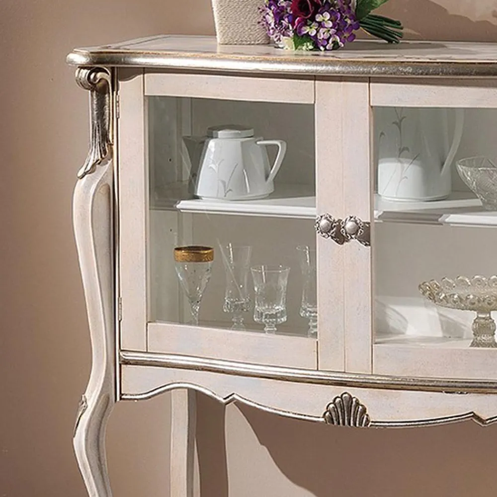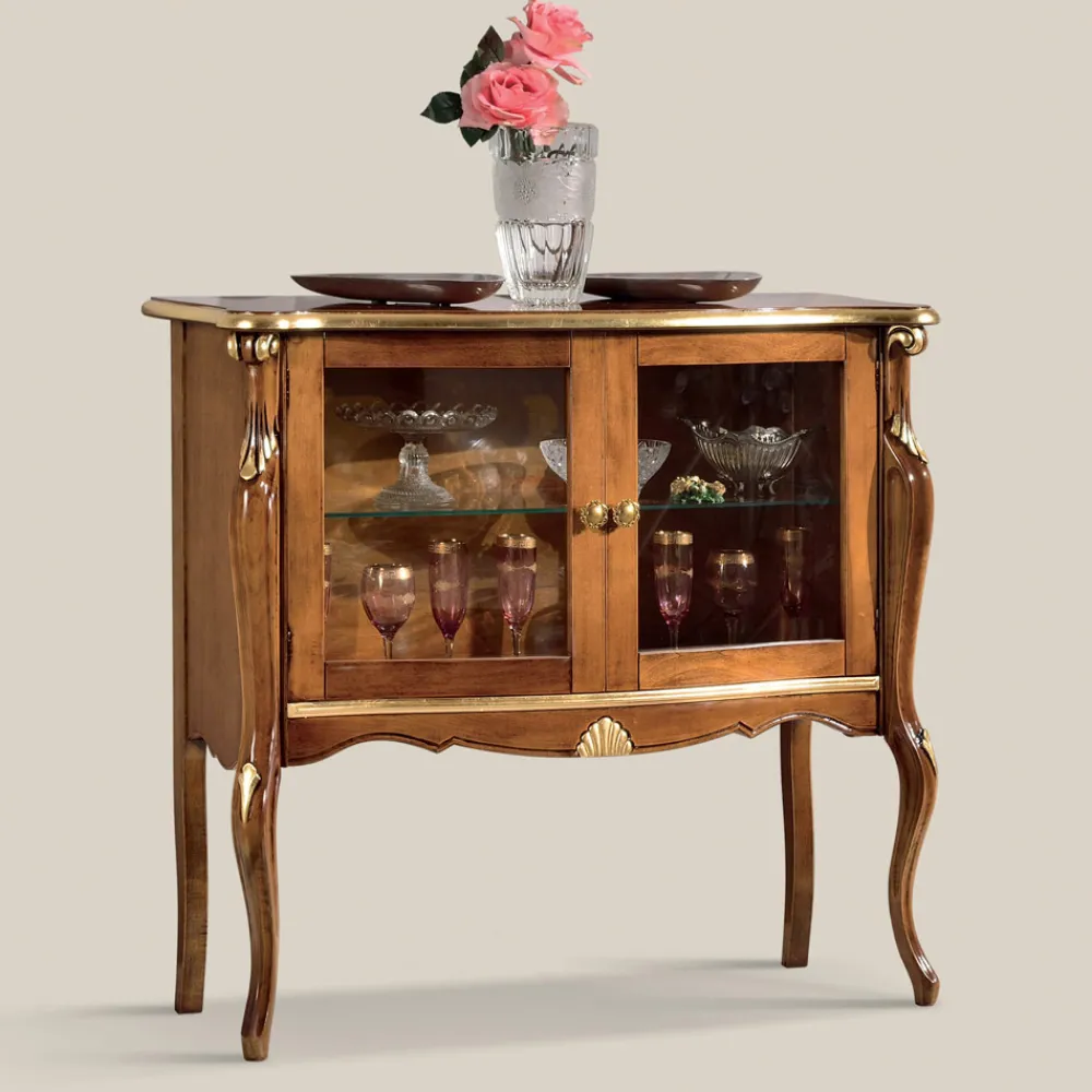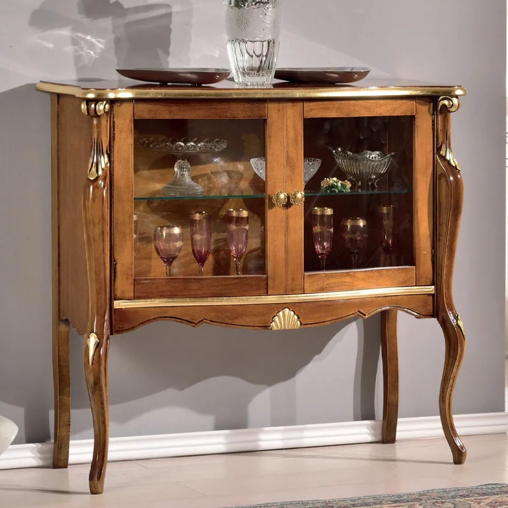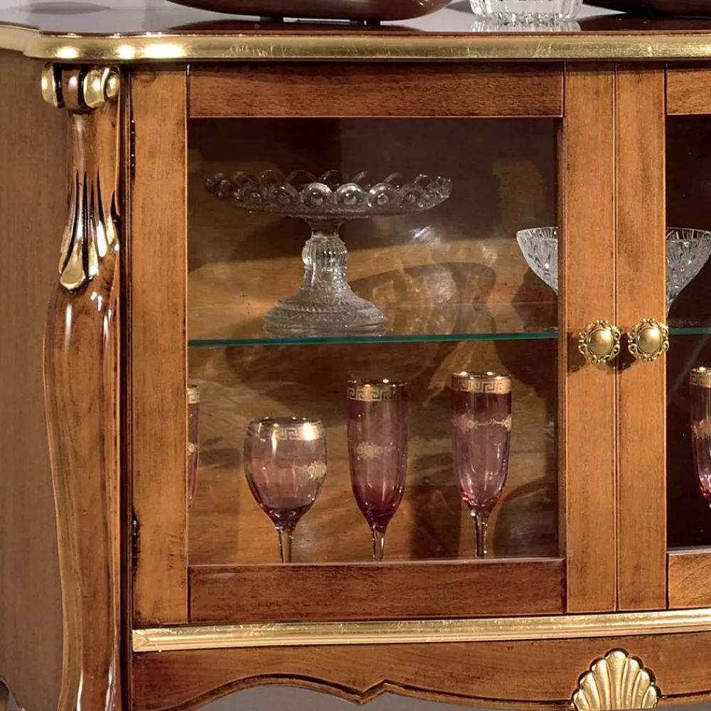 Wohnzimmervitrine im klassischen Stil aus Holz mit 2 eleganten Glastüren, ideal, um Ihr Wohnzimmer mit zeitloser Eleganz zu dekorieren. Erhältlich in zwei Varianten: Bassano-Nussbaum und Antikgold-Finish oder in Weiß und Silberholz .