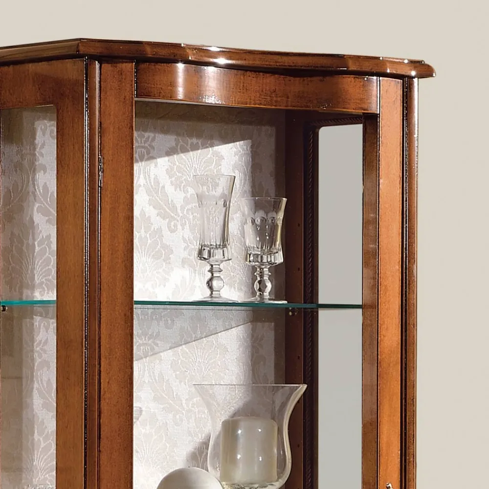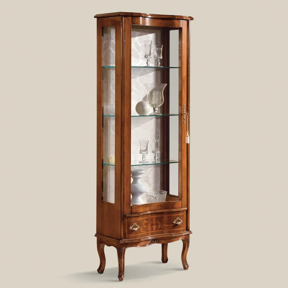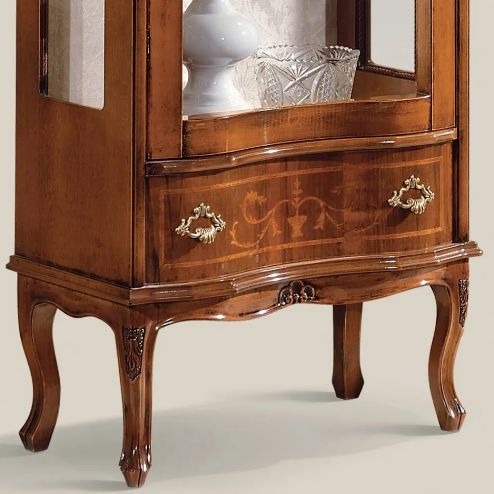 Wohnzimmervitrine aus Edelholz, erhältlich in Nussbaum mit goldenen Einlagen oder in Weiß mit silbernen Details , mit Tür und praktischer Schublade . Diese elegante und zeitlose Vitrine im klassischen Stil ist ideal, um durch die Beschwörung der Atmosphäre vergangener Zeiten beeindruckende Umgebungen zu schaffen. Vollständig in Italien von erfahrenen Handwerksmeistern hergestellt, vollendet mit Weisheit und Geschmack für Eleganz. Die Produktion erfolgt unter Verwendung hochwertiger Materialien und mit der größten Sorgfalt und Professionalität, die die Produkte Made in Italy auszeichnet .