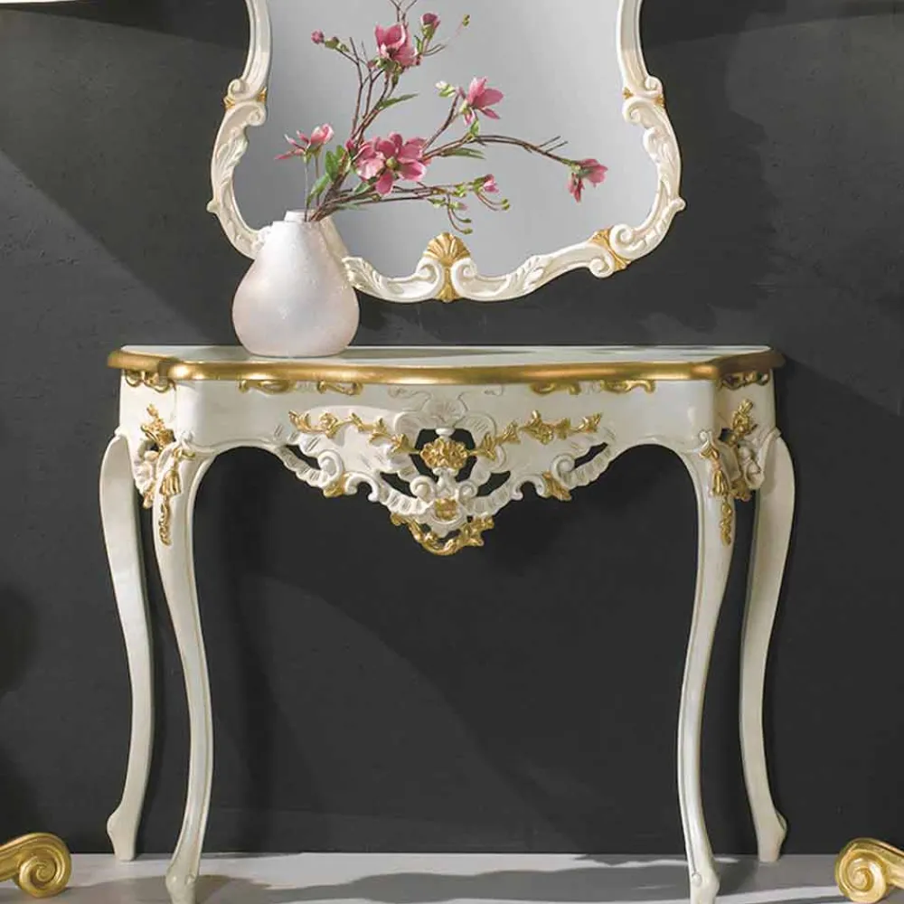 Dekorieren Sie Ihr Wohnzimmer mit dem in Italien hergestellten Spiegel und der Konsole, die Ihrem Raum einen Hauch von Klasse verleihen und ihn verschönern können.