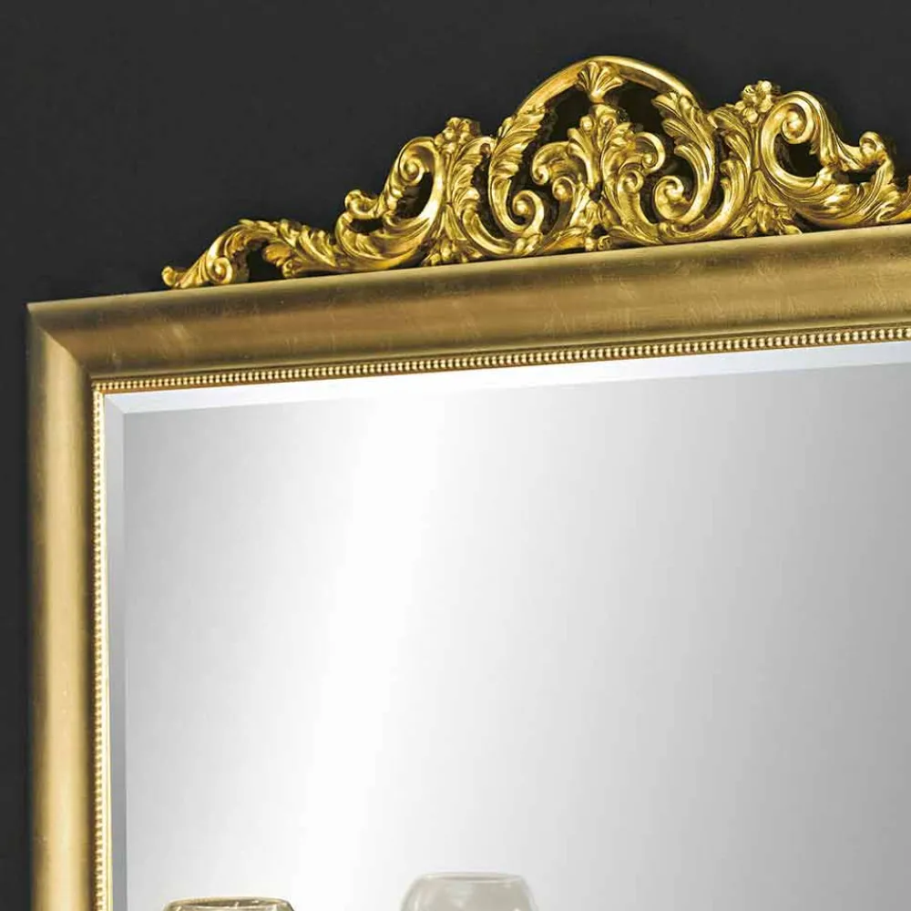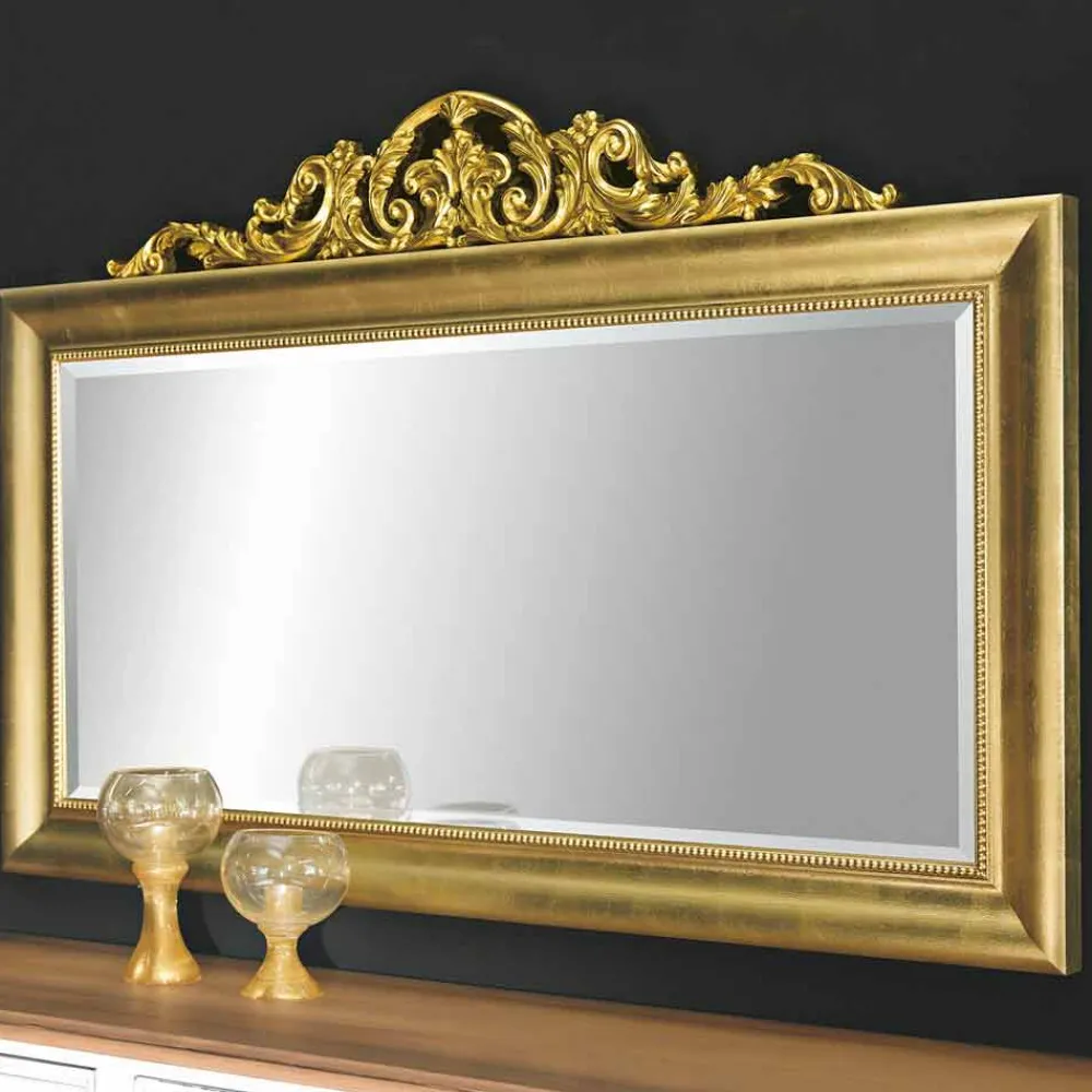 Dieser rechteckige Spiegel ist eine großartige Mischung aus Erhabenheit und Raffinesse. Der mit aufwendigen Schnitzereien und Arabesken verzierte Rahmen erinnert an den Charme antiker Gebäude. Im Mittelpunkt steht die prächtige obere Verzierung, ein wahres Meisterwerk der Bildhauerei, das mit Schnörkeln und Blumenmotiven überragt und ihm eine imposante künstlerische Präsenz verleiht.