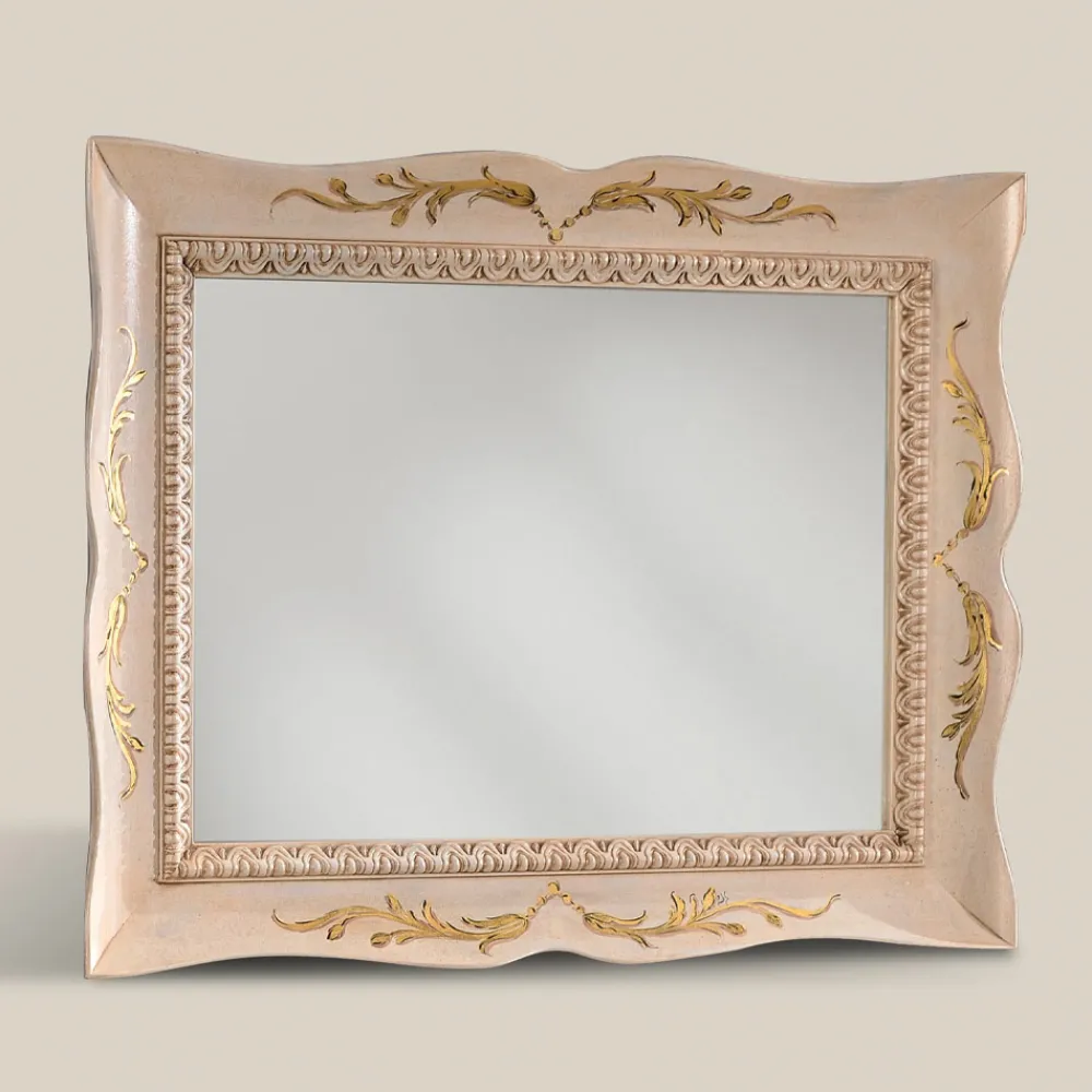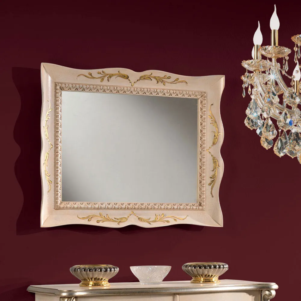 Rechteckiger Spiegel im klassischen Stil mit verziertem Rahmen aus weißem Holz , perfekt, um Ihren Wohnbereich mit Eleganz und Persönlichkeit zu dekorieren.