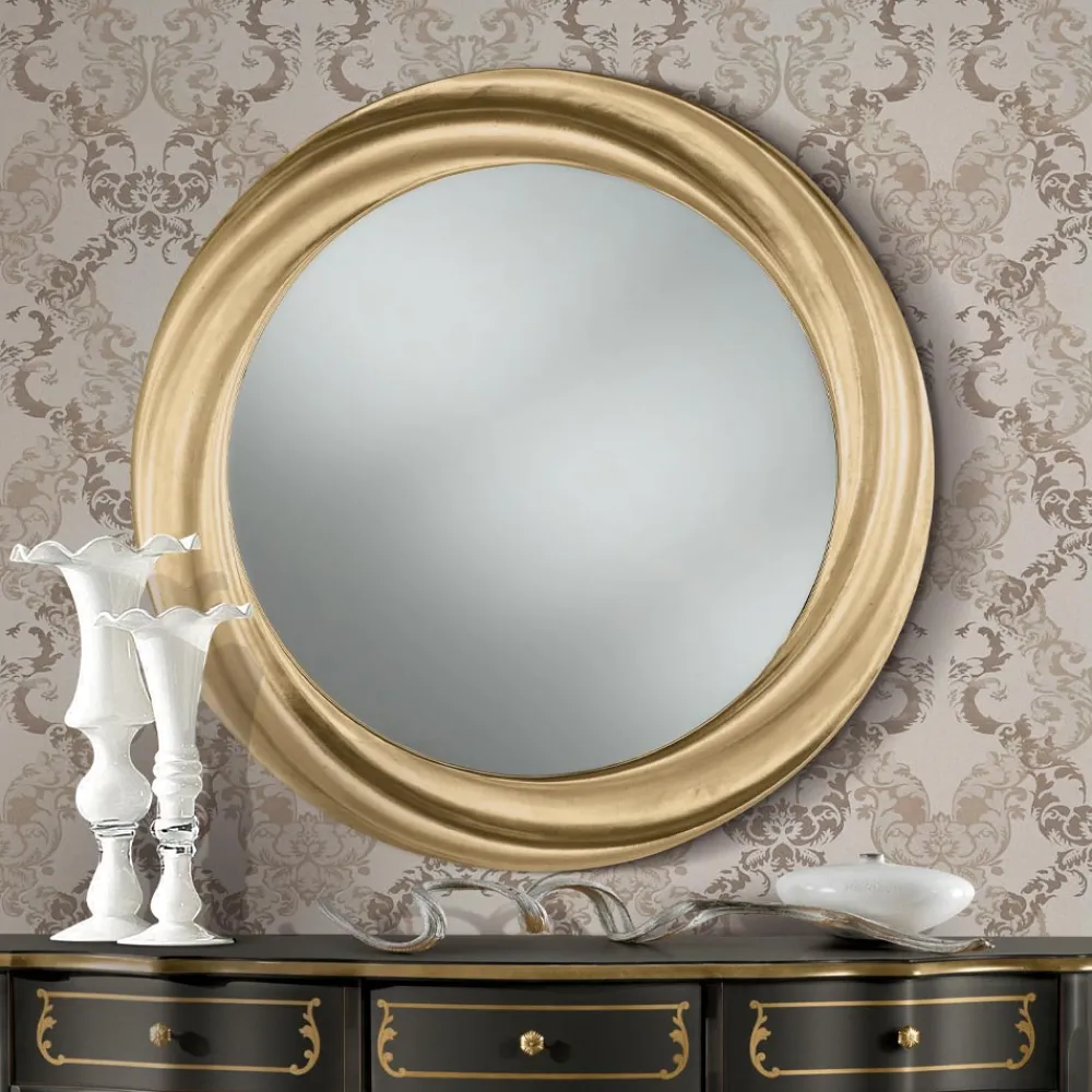 Runder Spiegel mit Holzrahmen verziert mit Blattgold . Dank seines klassischen Stils ist dieser Spiegel ideal, um jedem Raum eine elegante und luxuriöse Note zu verleihen.
