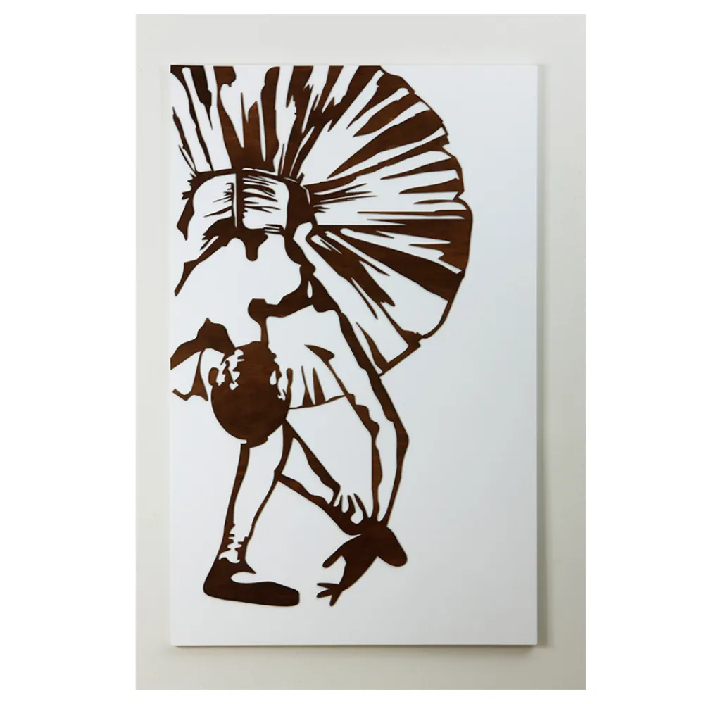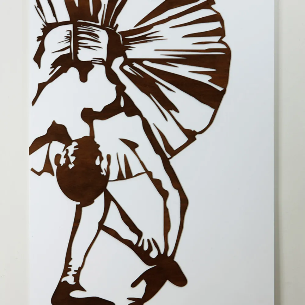 Die dekorative Platte wird mithilfe der Lasermarkierungstechnik hergestellt, die ein Flachrelief auf dem Material erzeugt und so verschiedene Farbabstufungen auf der Platte erzeugt. Das Gestell besteht aus weiß lackiertem Holz mit wengefarbenen Applikationen.