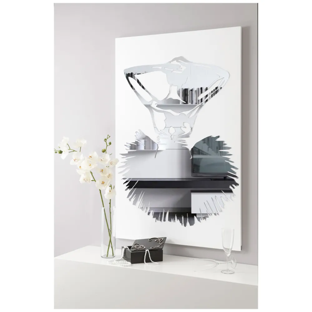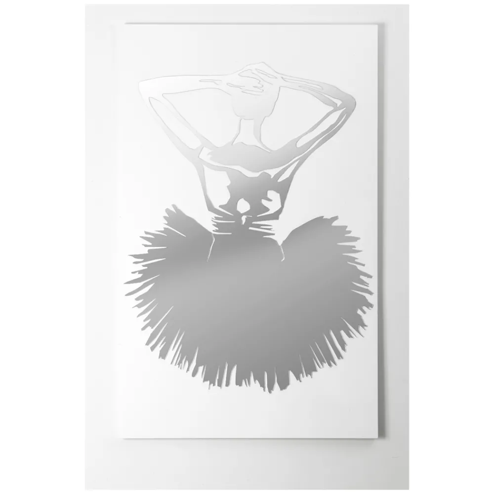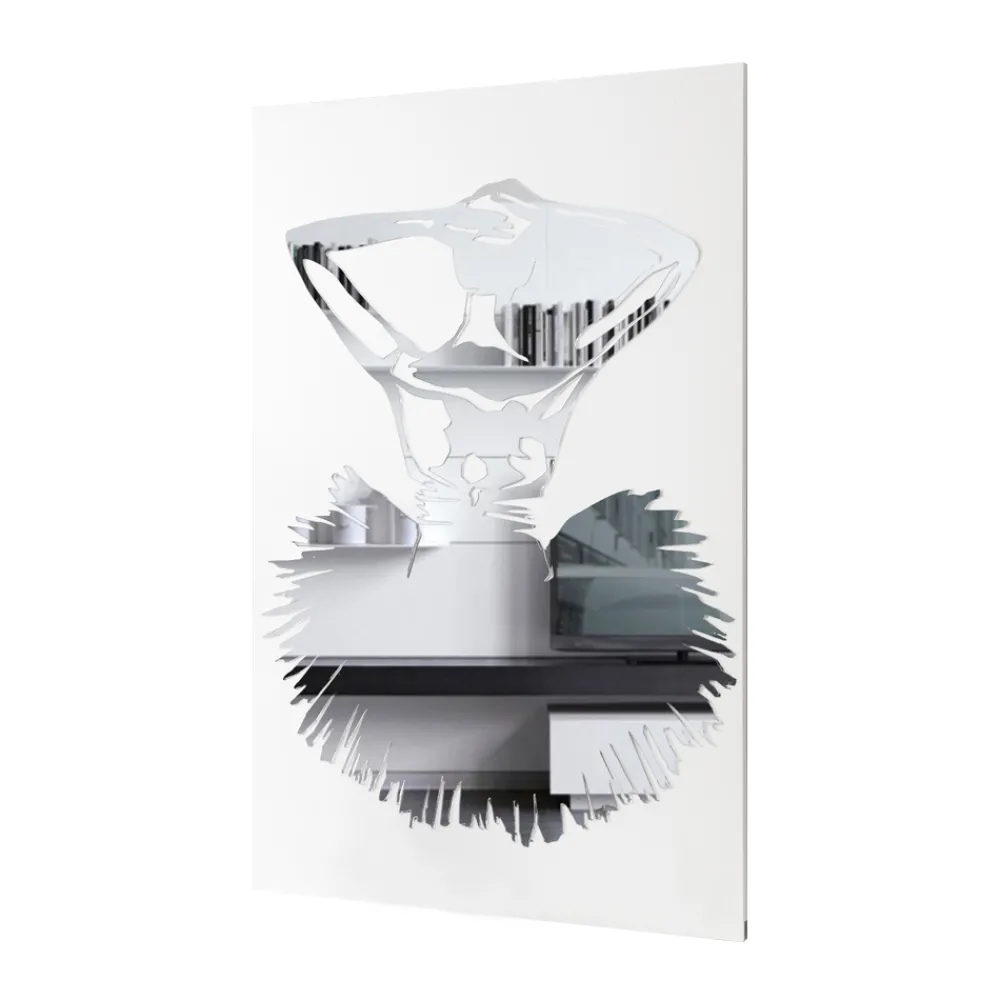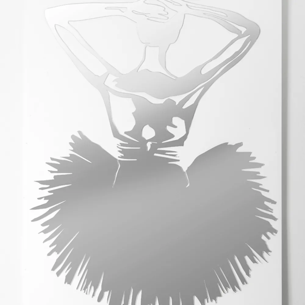 Die Dekorplatte wird mithilfe der Lasermarkierungstechnik hergestellt, die ein Flachrelief auf dem Material erzeugt und so unterschiedliche Farbabstufungen erzeugt. Das Bild besteht aus weiß lackiertem Holz mit Spiegeldekor. Es stellt eine Tänzerin dar, die auf Spiegelplexiglas gefertigt ist, was tatsächlich der Fall ist Funktioniert auch als Spiegel.