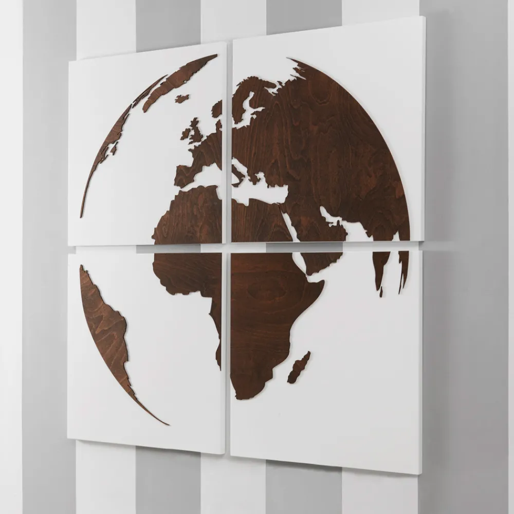 Komposition mit Darstellung der Welt aus mattweißem Holz und applizierter Verzierung aus Wengeholz.