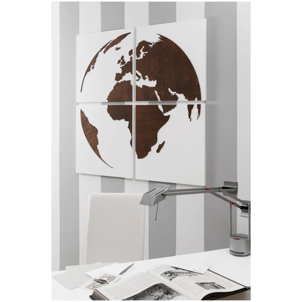 Komposition aus vier Tafeln mit wengefarbenen Holzdekorationen des Globus. Hergestellt in Italien