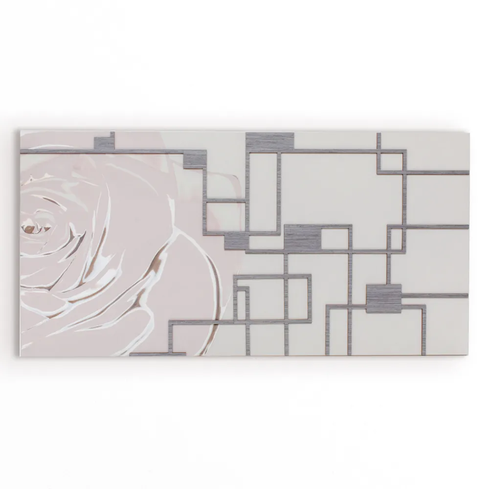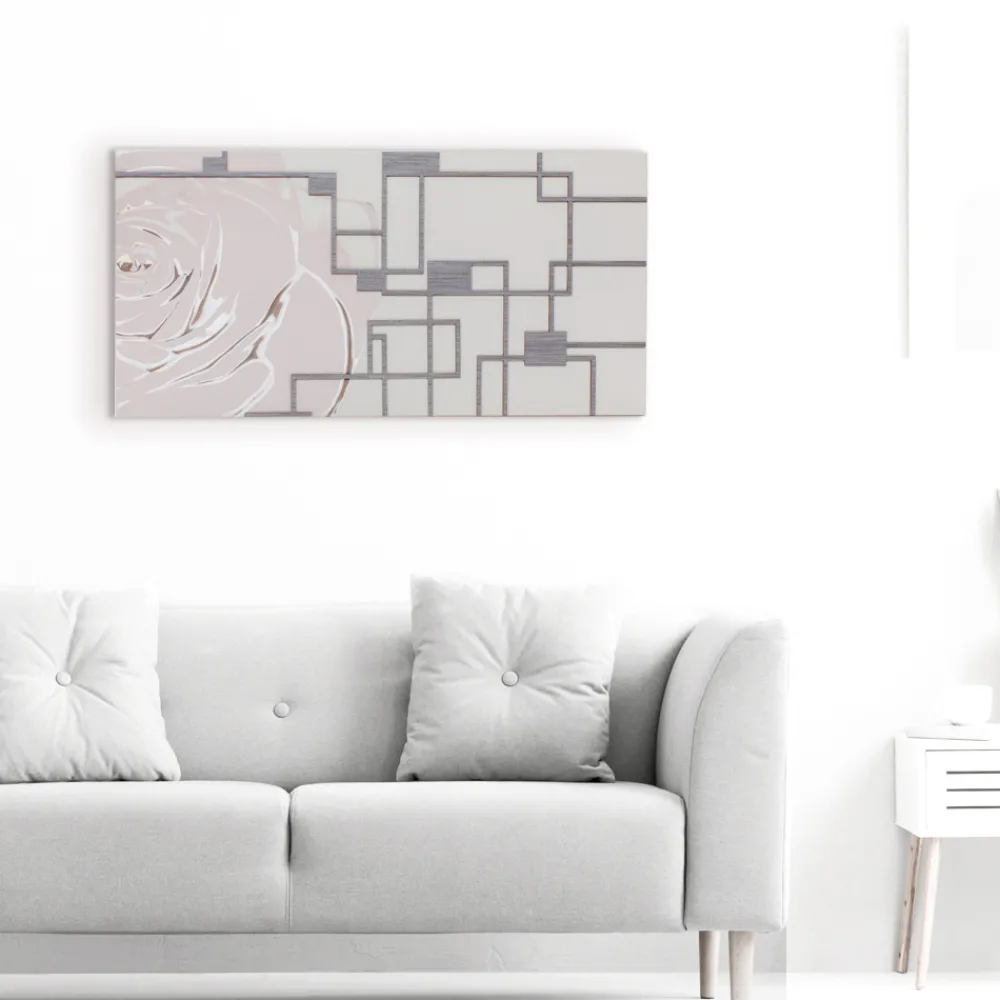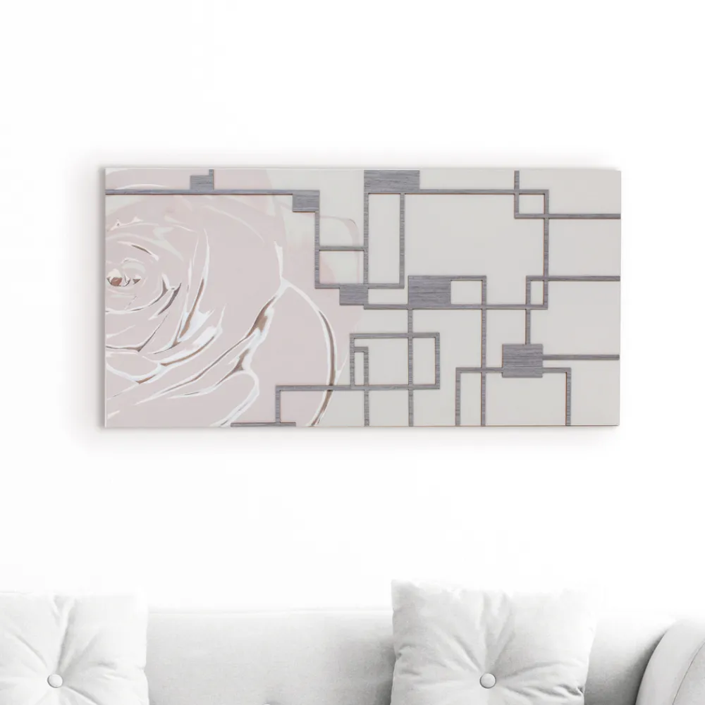Die dekorative Platte wird mithilfe der Lasermarkierungstechnik hergestellt, die ein Flachrelief auf dem Material erzeugt und verschiedene Farbabstufungen der auf der Platte erzeugten Blütenblätter erzeugt. Das Gestell besteht aus sandlackiertem Holz mit grauen Applikationen. Sanfte Rosatöne spielen mit dem geometrischen Dekor aus grauem Holz.