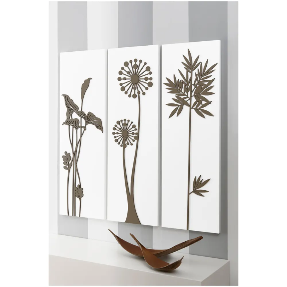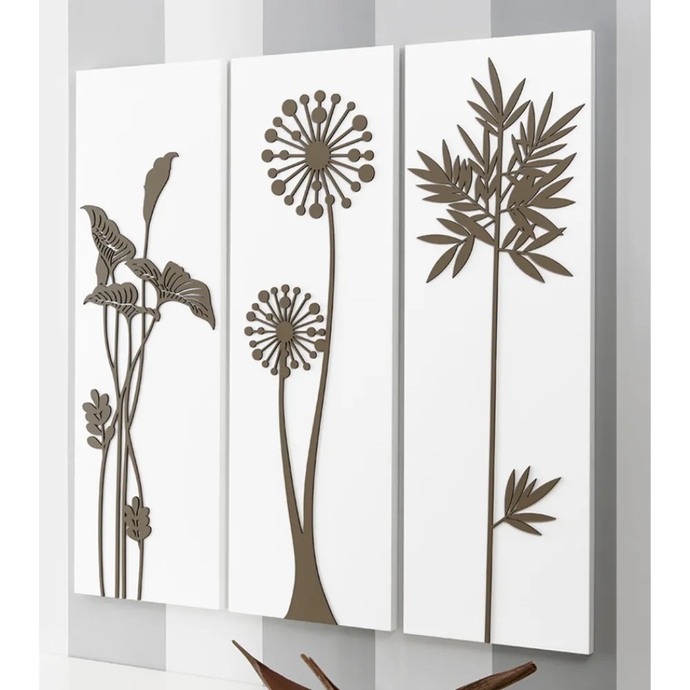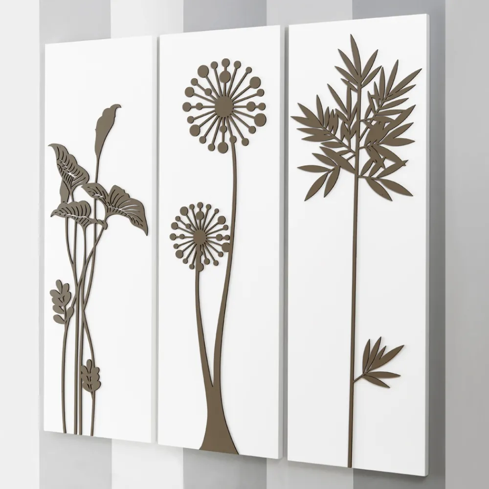 Die Zusammensetzung der Paneele erfolgt mithilfe der Lasermarkierungstechnik , die ein Flachrelief auf dem Material erzeugt und so unterschiedliche Farbabstufungen auf dem Paneel erzeugt. Das Paneel besteht aus weiß lackiertem Holz mit taubengrauem Dekor. Es stellt stilisierte Blumen und Blätter dar, die ein wesentliches Tafeltrio bilden.