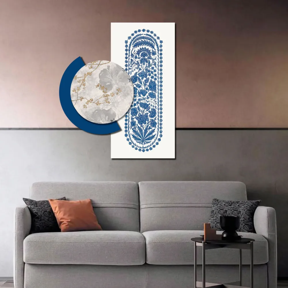 Komposition aus Holztafeln, 1 rechteckig mit abstraktem Dekorationsdruck und 1 rund mit Aufdruck von Zweigen, Blättern und Blumen und Halbmonddetails
