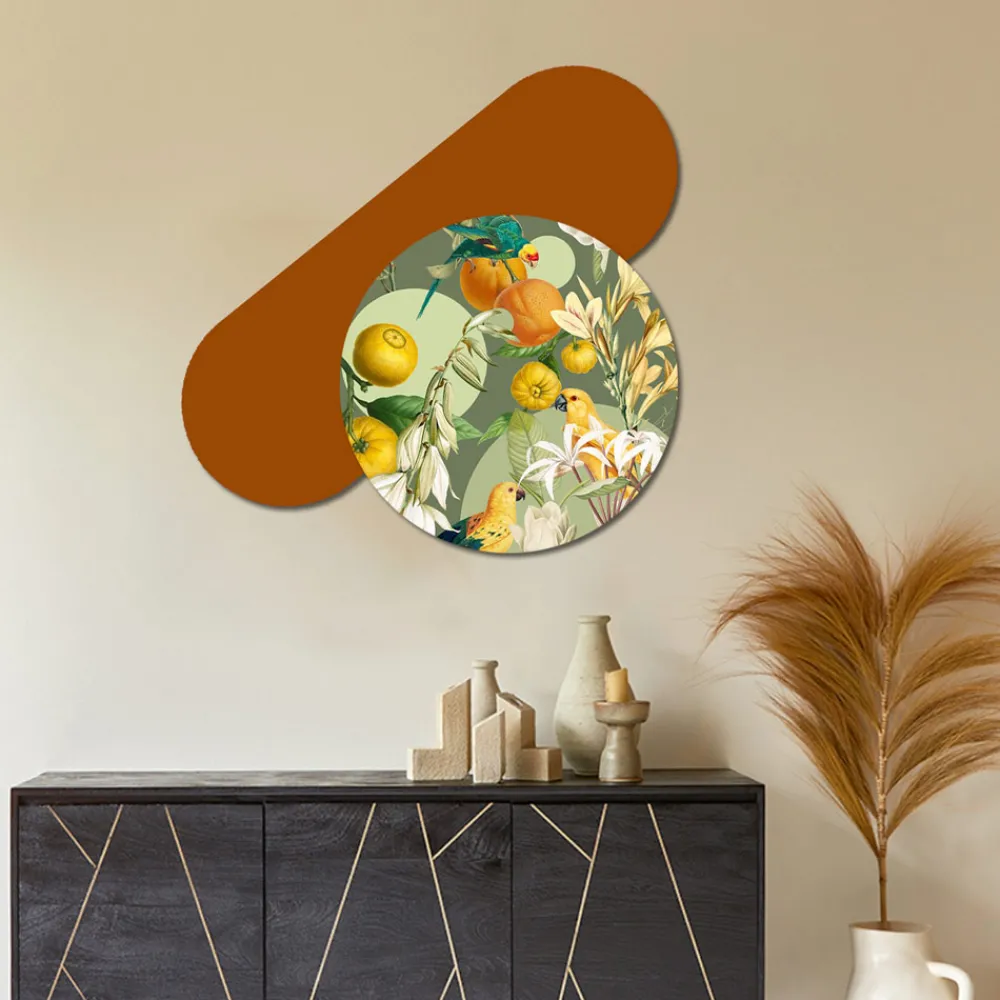 Komposition aus Holztafeln mit Aufdrucken von Papageien und exotischen Früchten.