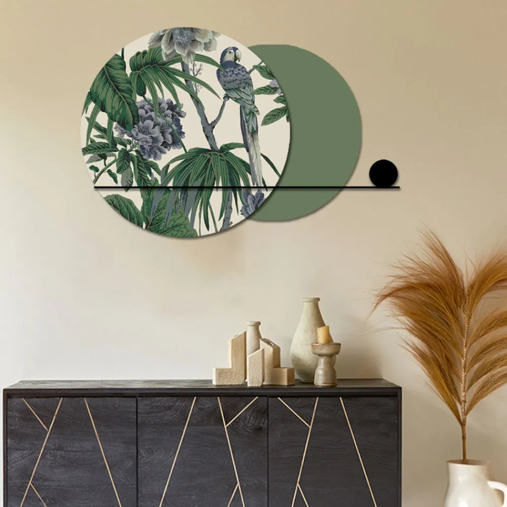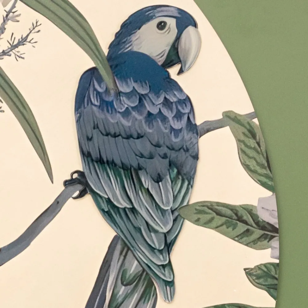 Komplett aus Holz gefertigtes Paneel mit Papageien- und Zweigaufdruck und schwarzer Plexiglasplatte im Relief.