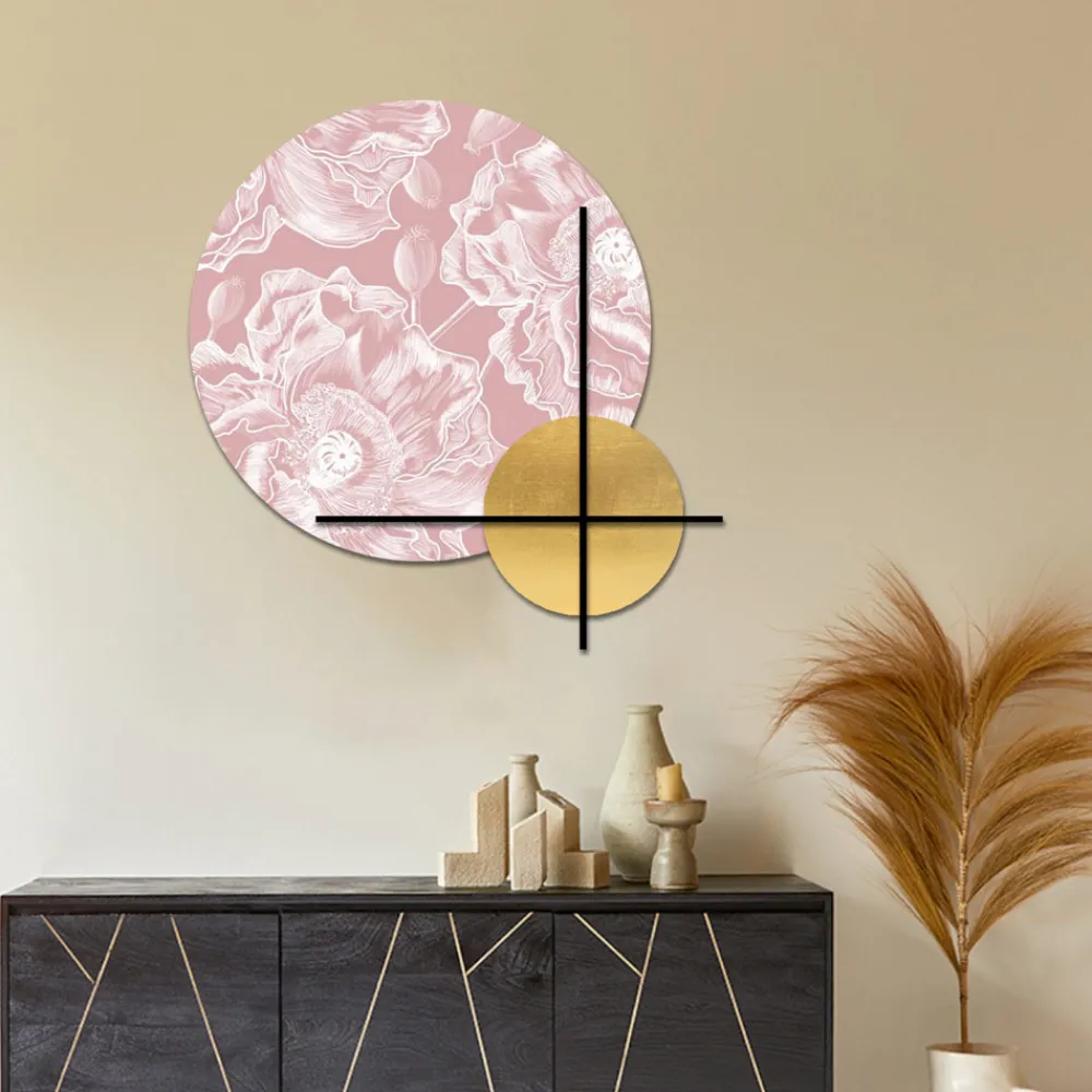 Komposition aus Holzplatten mit Blumendruck und 2 schwarzen Plexiglasplatten im Relief.