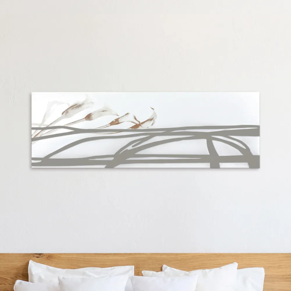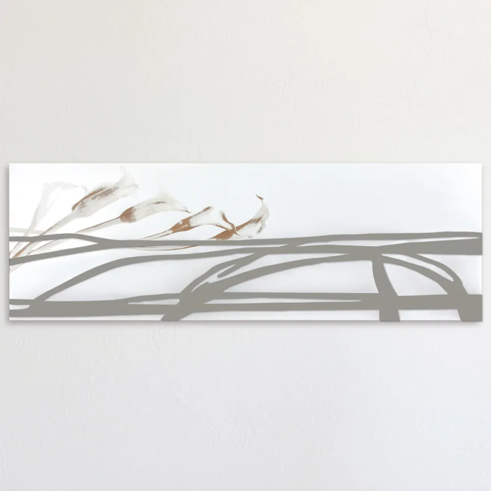 Die dekorative Platte wird mithilfe der Lasermarkierungstechnik hergestellt, die ein Flachrelief auf dem Material erzeugt und so unterschiedliche Farbabstufungen auf der Platte erzeugt. Das Paneel besteht aus weiß lackiertem Holz mit lehmfarbenen Applikationen. Das Paneel ist dank der verspiegelten Plexiglasdekoration und der Markierung der Calla-Lilien elegant und schlicht.