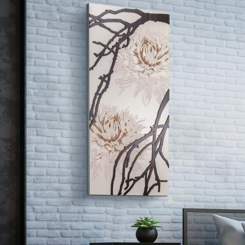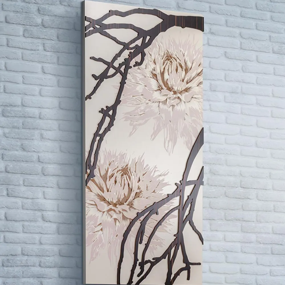Die dekorative Platte wird mit der Lasermarkierungstechnik hergestellt, die ein Flachrelief auf dem Material erzeugt und verschiedene Farbabstufungen der Blume, genauer gesagt der Dahlie, erzeugt. Das Gemälde besteht aus matt sandlackiertem Holz mit Applikationen aus Ebenholz . Die rosa Farbe der Dahlien wird durch die Lasermarkierungstechnik verliehen.
