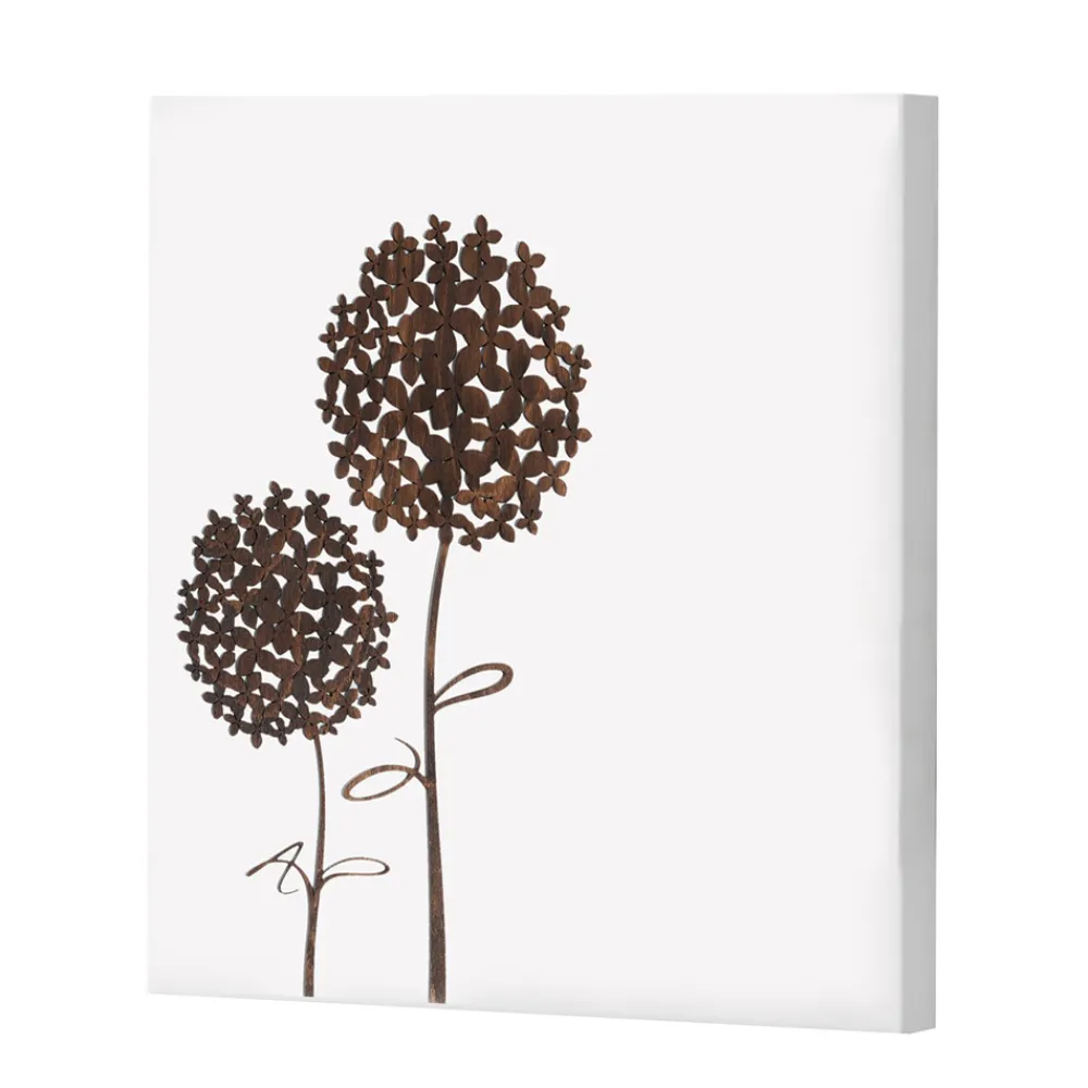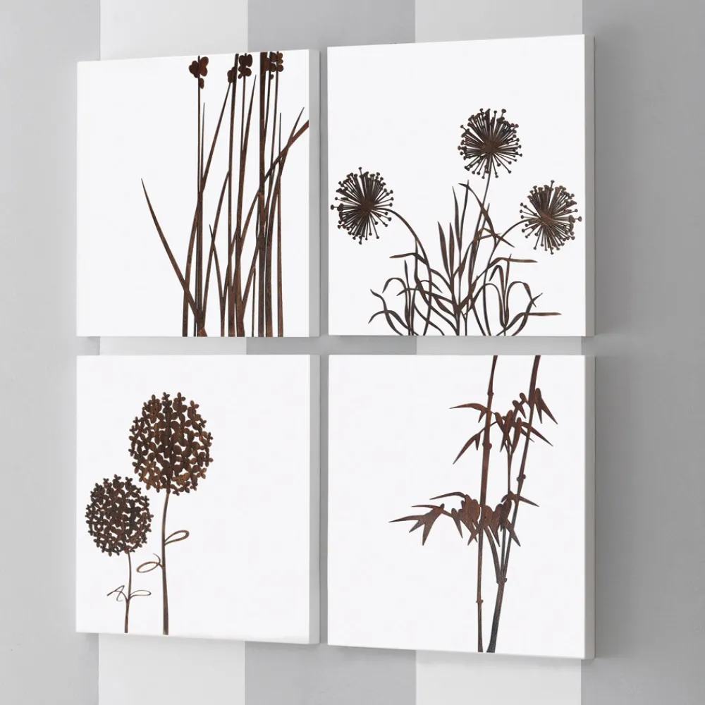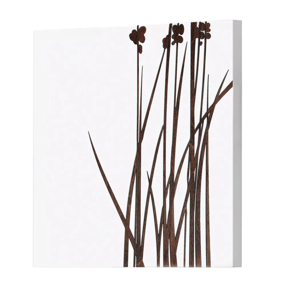 Zusammensetzung aus 4 mattweißen Paneelen mit Gravur oder Dekoration aus Wengeholz jeweils mit Darstellung von Hortensie, Allium, Thypa und Bambusrohr.