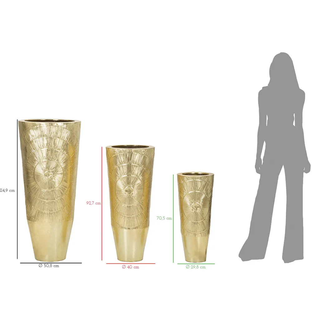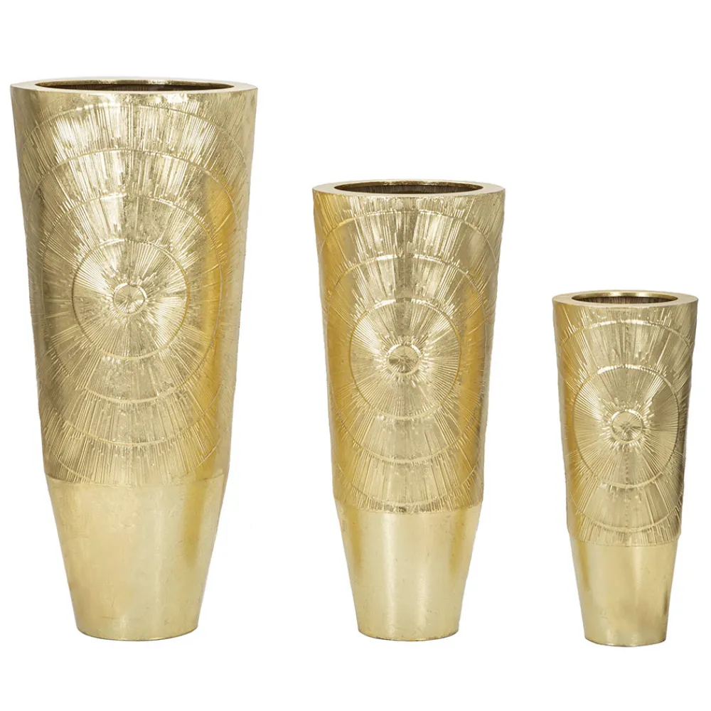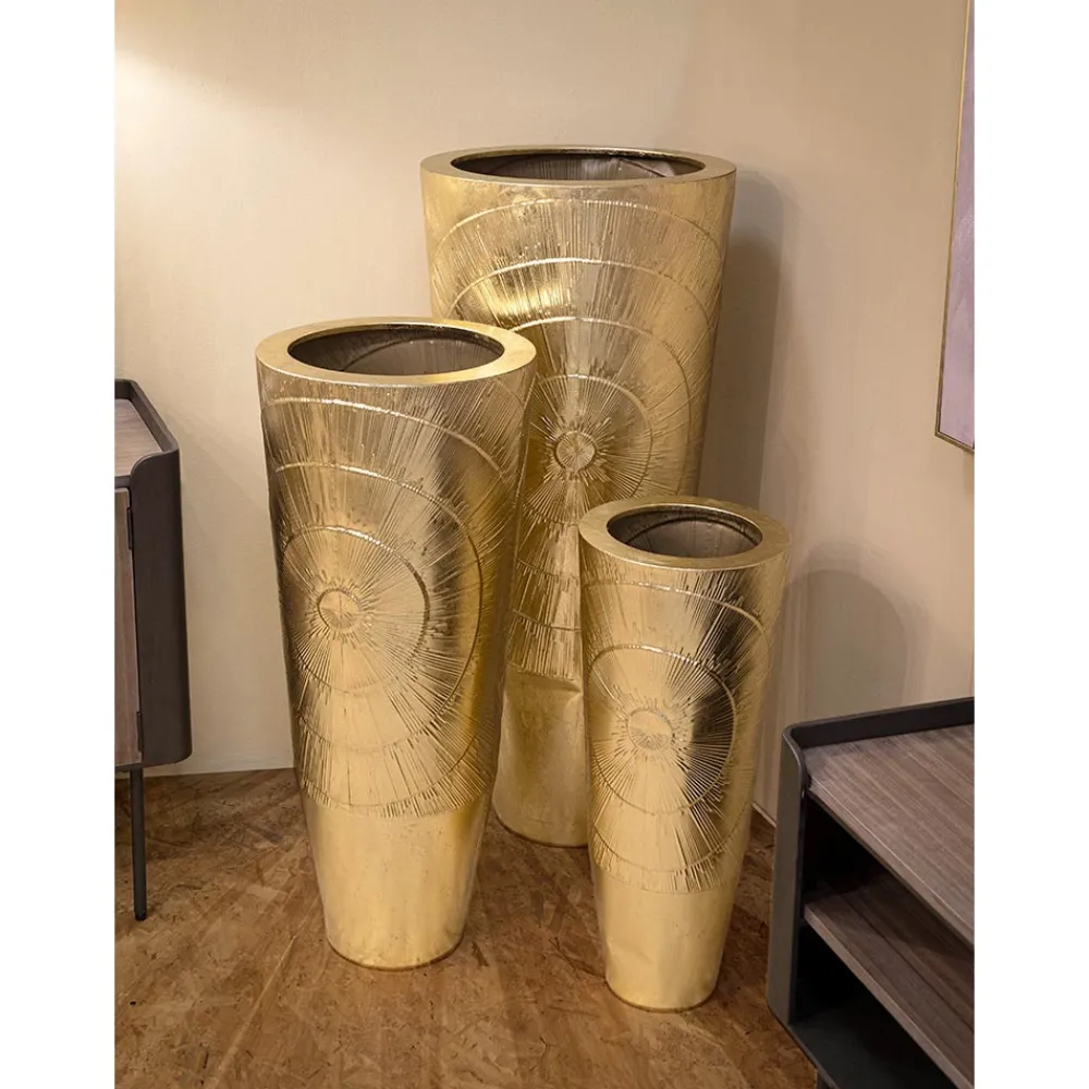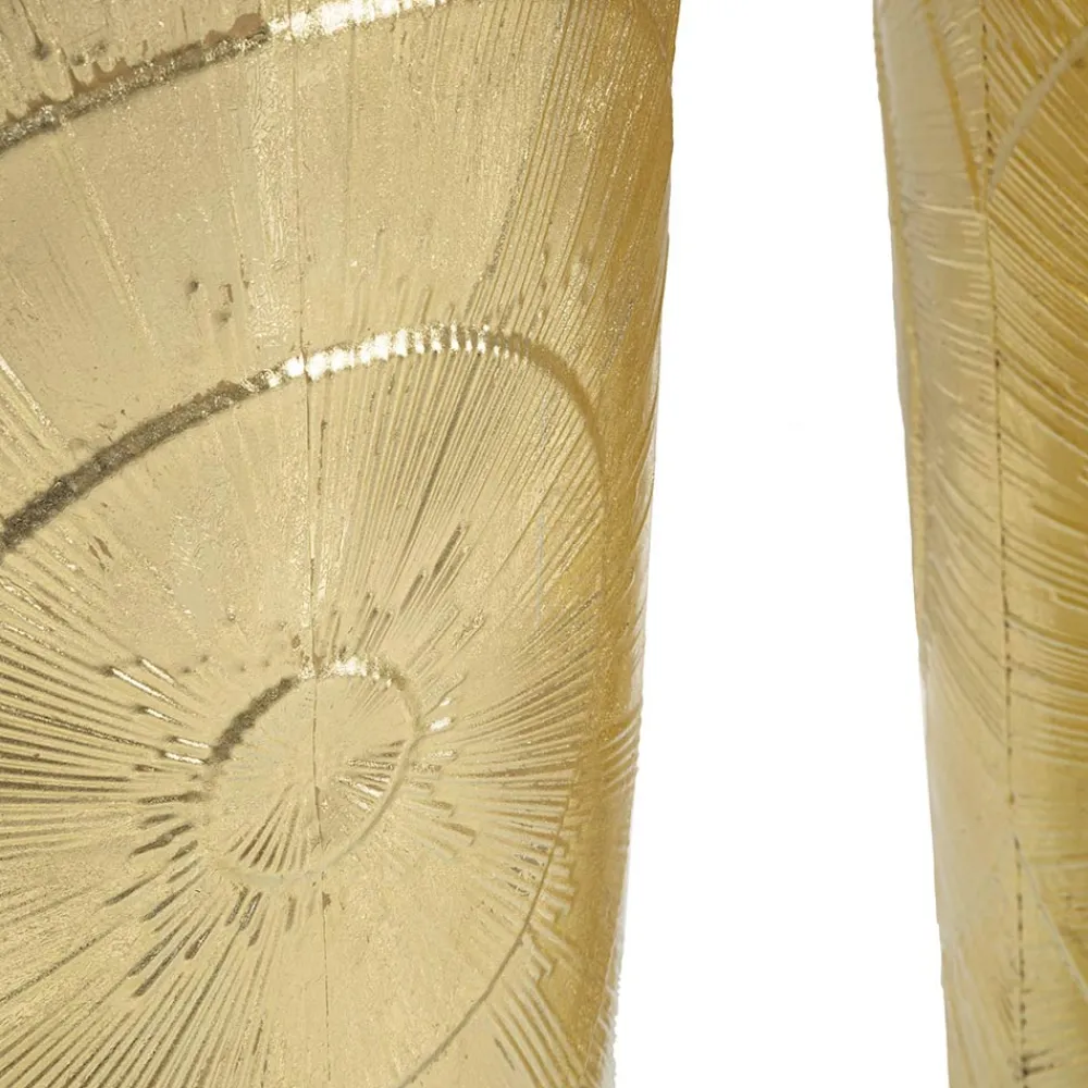 Diese dekorativen Vasen sind wahre Skulpturen, Kunstwerke, die den Blick auf sich ziehen und jede Umgebung elegant bereichern. Ihr Goldton erzeugt einen warmen und einladenden visuellen Effekt, während die in das Eisen eingravierten Linien einen strahlenden Effekt erzeugen, der der glatten Oberfläche der Vasen Bewegung und Leben verleiht.