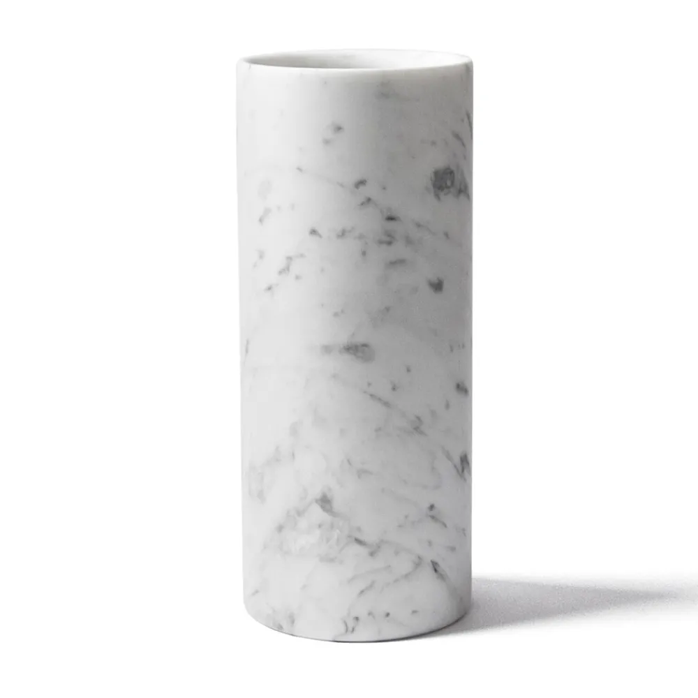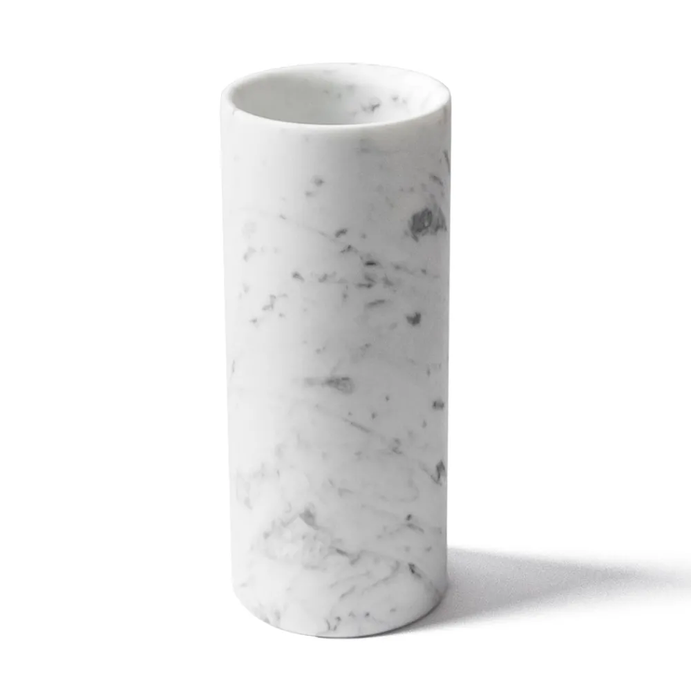 Handgefertigte Vase in zylindrischem Design aus weißem Carrara-Marmor, hergestellt in Italien.