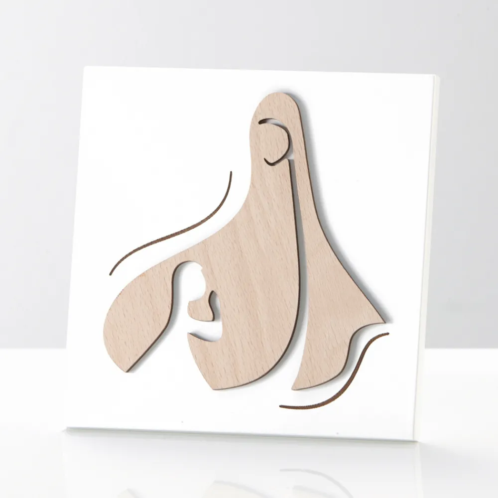 Heiliges Bild mit der Darstellung der Erscheinung der Madonna aus Naturholz und Lasergravur. Weiß lackierte Holzplatte mit Stützfuß und Loch zum Aufhängen an der Wand.